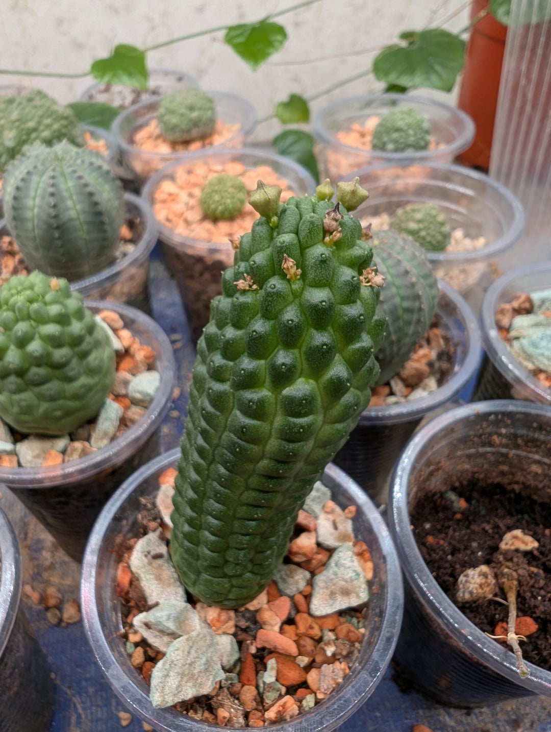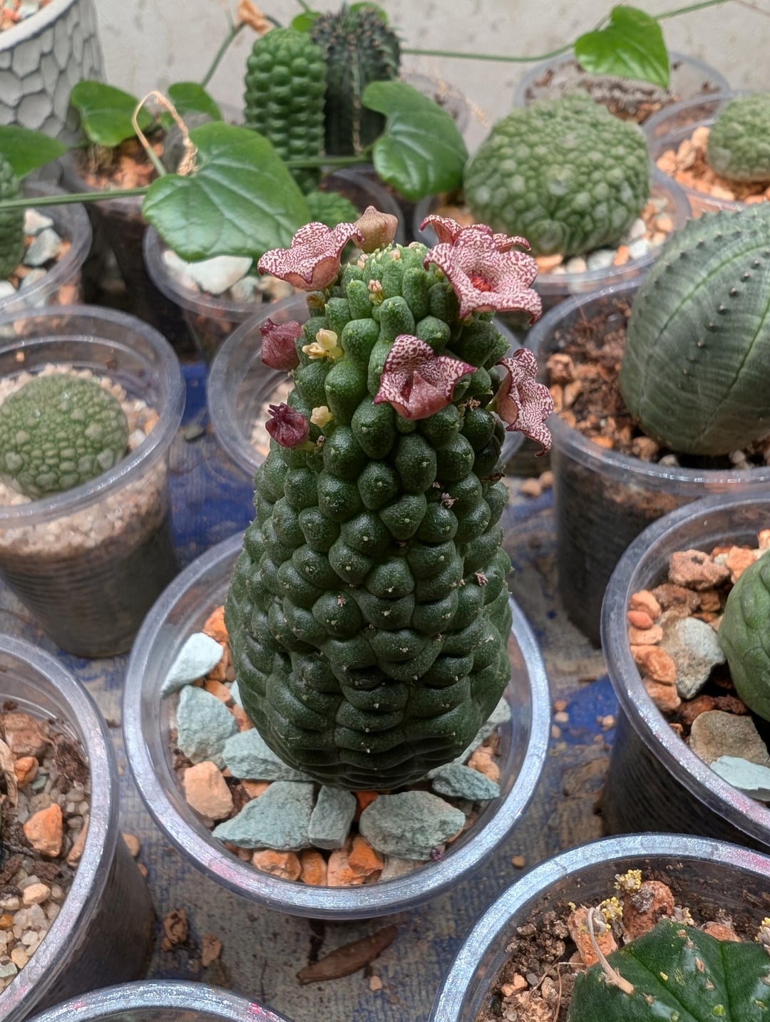 My 2 years old Larryleachia cactiformis flowering again, about half year after the first flowering. Now more lush flowers. Also, her little sisters growing buds too! Growing fully under grow lights, I think it's a good result. Yea, one plant is a bit etiolated due to improper lighting on early stage. Now I bought a new lights, so it's even stronger.