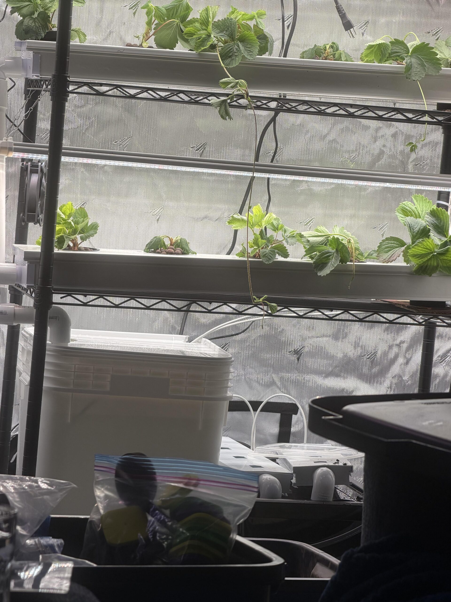 So, finally washed my strawberry crowns off and planted them in my aerogerdens and other table top systems in December. So my plants have been living in those systems while I finish putting this together. My mom died the day after I put them in the systems, so that is where they have been since mid December.