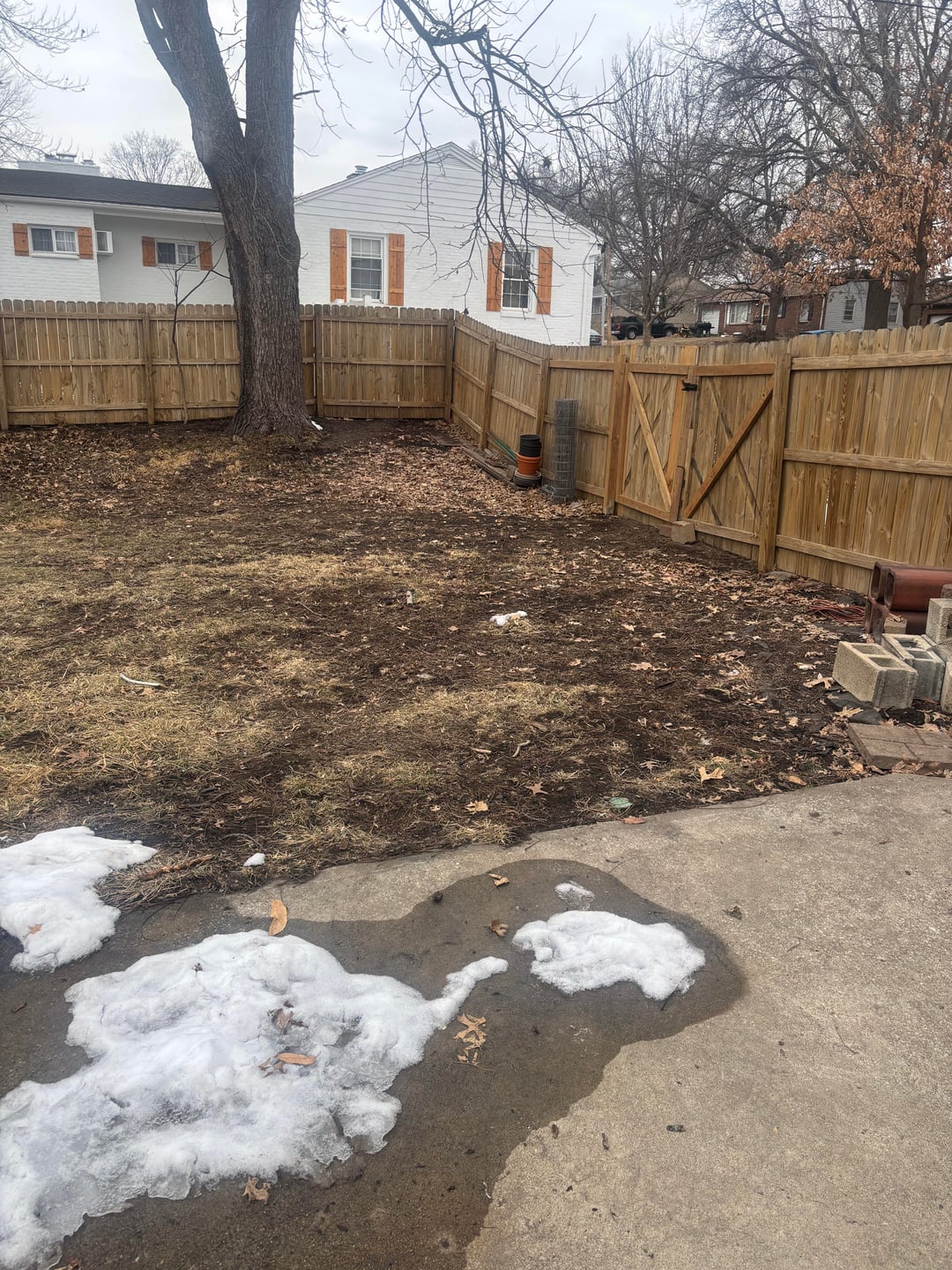 Those patches aren’t going to fill in on their own. In Kansas City clay that kind of bare soil usually screams compaction or shade issues, so you are likely looking at a core aeration and heavy overseeding with a tall fescue blend this spring just to get a baseline. If those trees in the back cast deep shade during the summer you are fighting a losing battle trying to force grass to grow all the way to the fence.