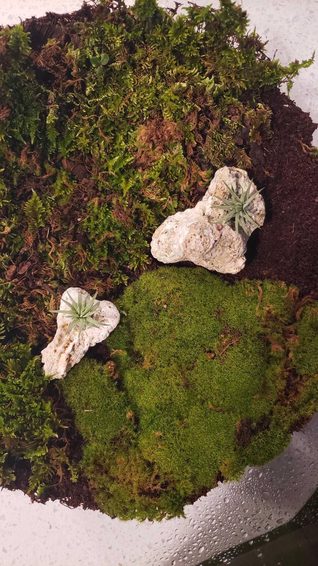 I recently bought two tiny air plants. I am keeping them in this big fish bowl that I have put seedling soil and some moss in. The air plants are sitting in some old rocks my wife collected in Hawaii back in 98'. I mist the moss every few days so its somewhat humid in the bowl. Does this seem like a good spot for my airplants? I live in a apartment with a east facing window in Shasta County CA that the bowl sits near.