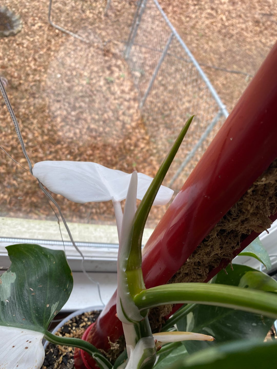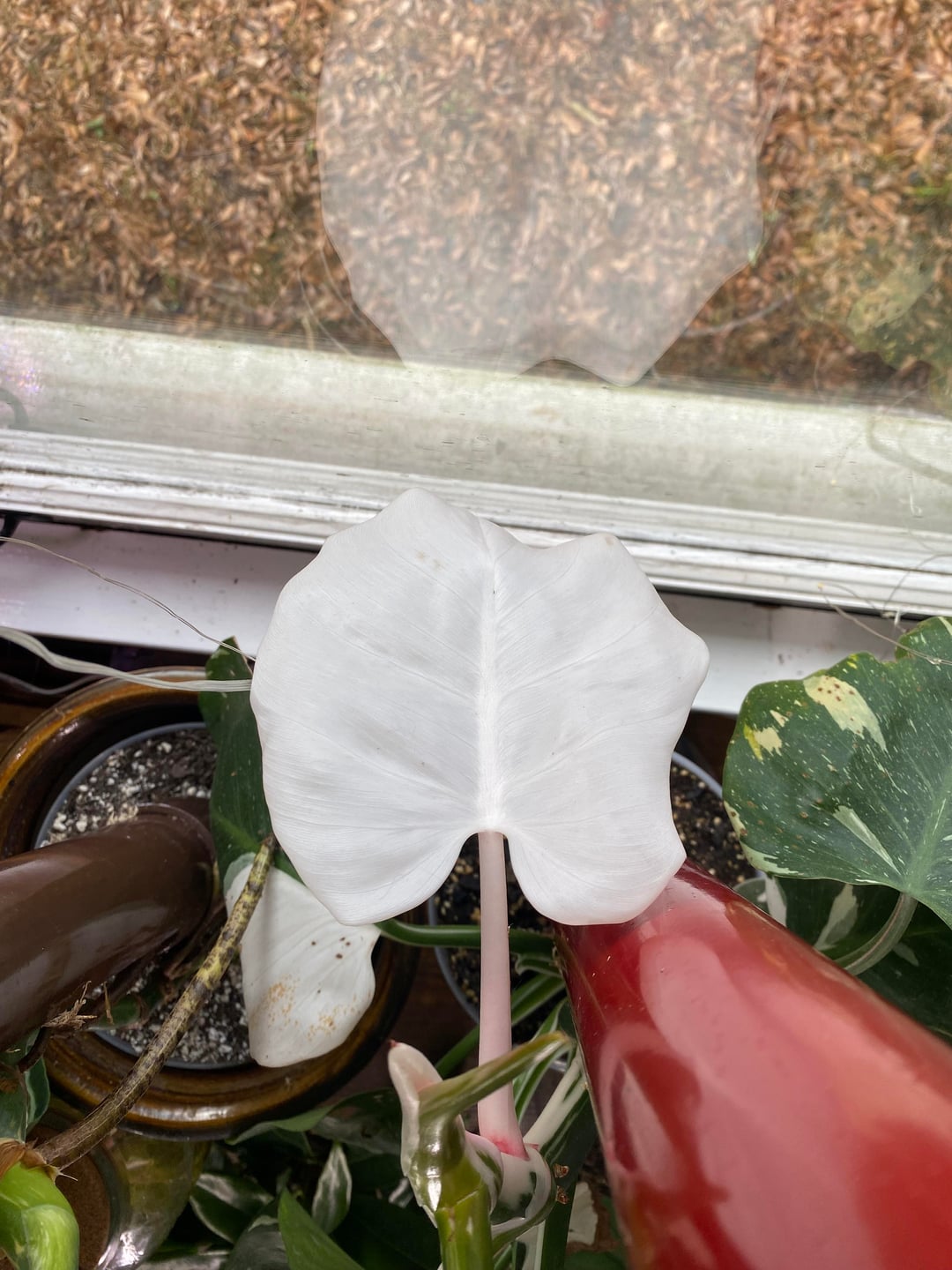 47 days ago I posted that my philodendron white knight was cooking up a totally white leaf! I was right unfortunately 😠surprisingly it seems to be holding its own so far though! I’m used to them crisping up pretty quickly but it’s still nice and shiny. The leaf it threw right after the white one was a beautiful mix of variegation!! Now it’s working on yet another <3 he had a weird moment but he’s just creative I think
