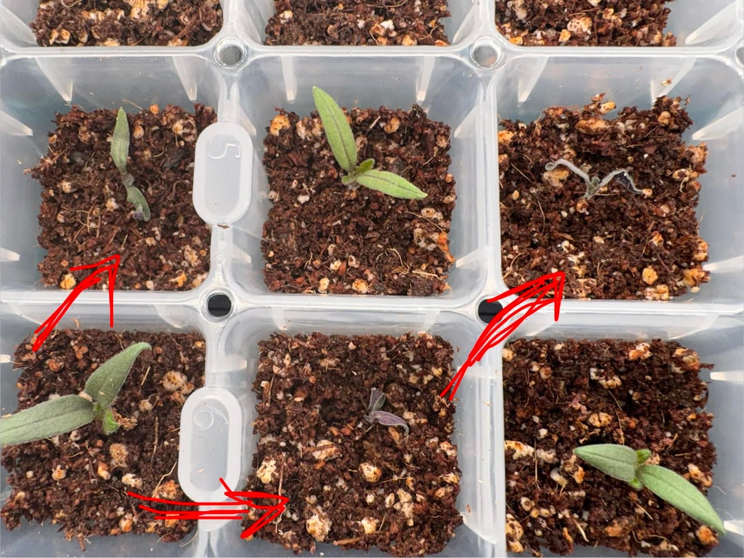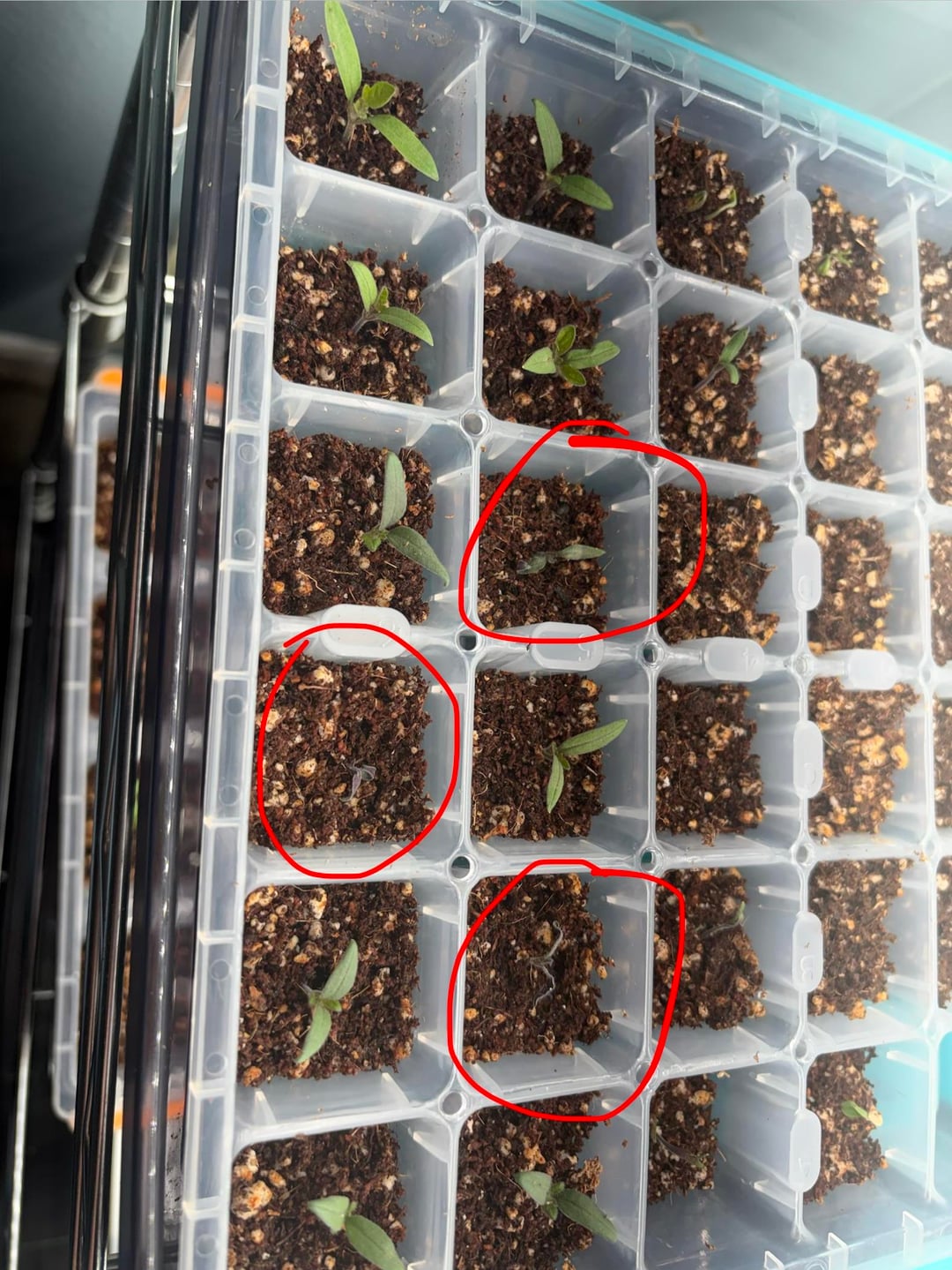 The rest seem to be doing alright but these ones just started curling up today. They're in 50/50 peat moss perlite in 1×1 cells. There's a fan on them off camera on just high enough to stir the leaves. I've been bottom watering as soon as the top soil starts to dry out which has been pretty much every day. The one on the top left of the first picture seems to recover a little after I watered today but still looks pretty rough. The others didn't change.