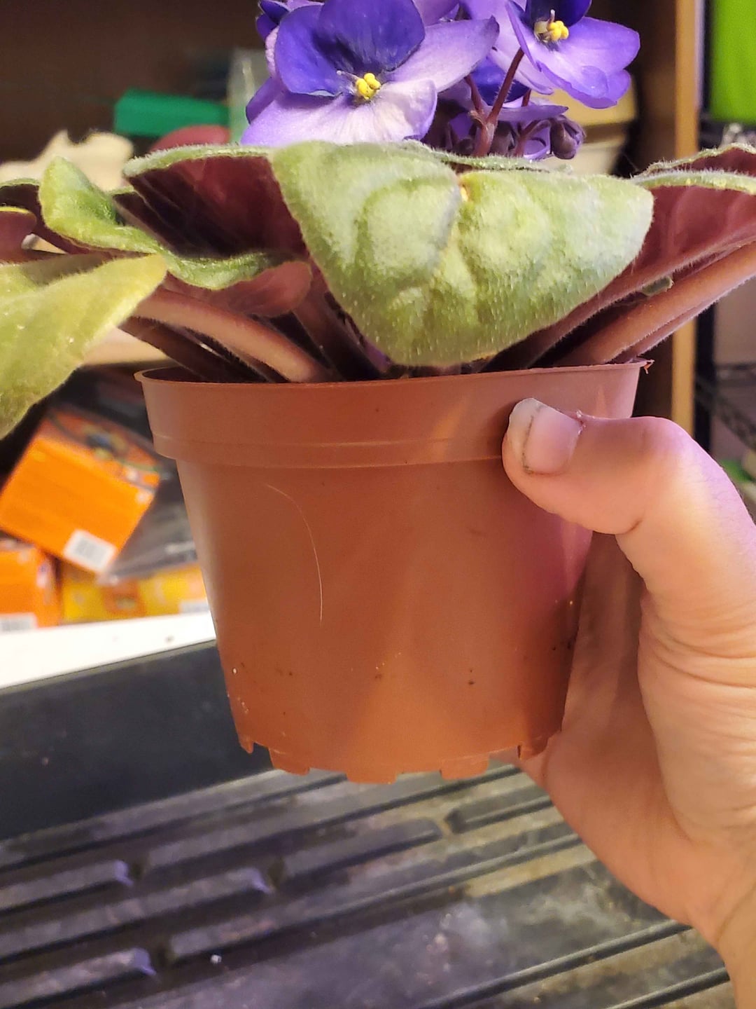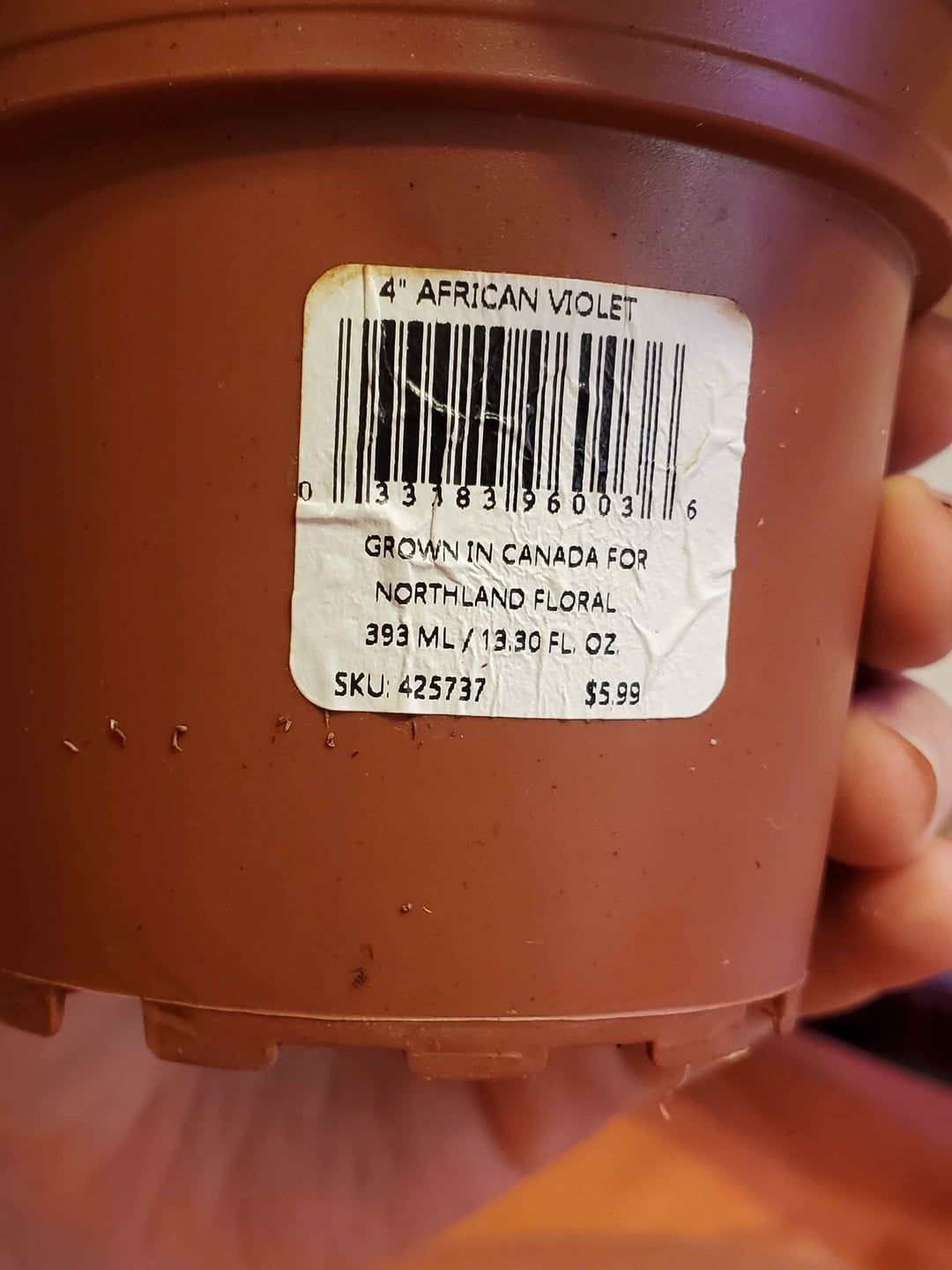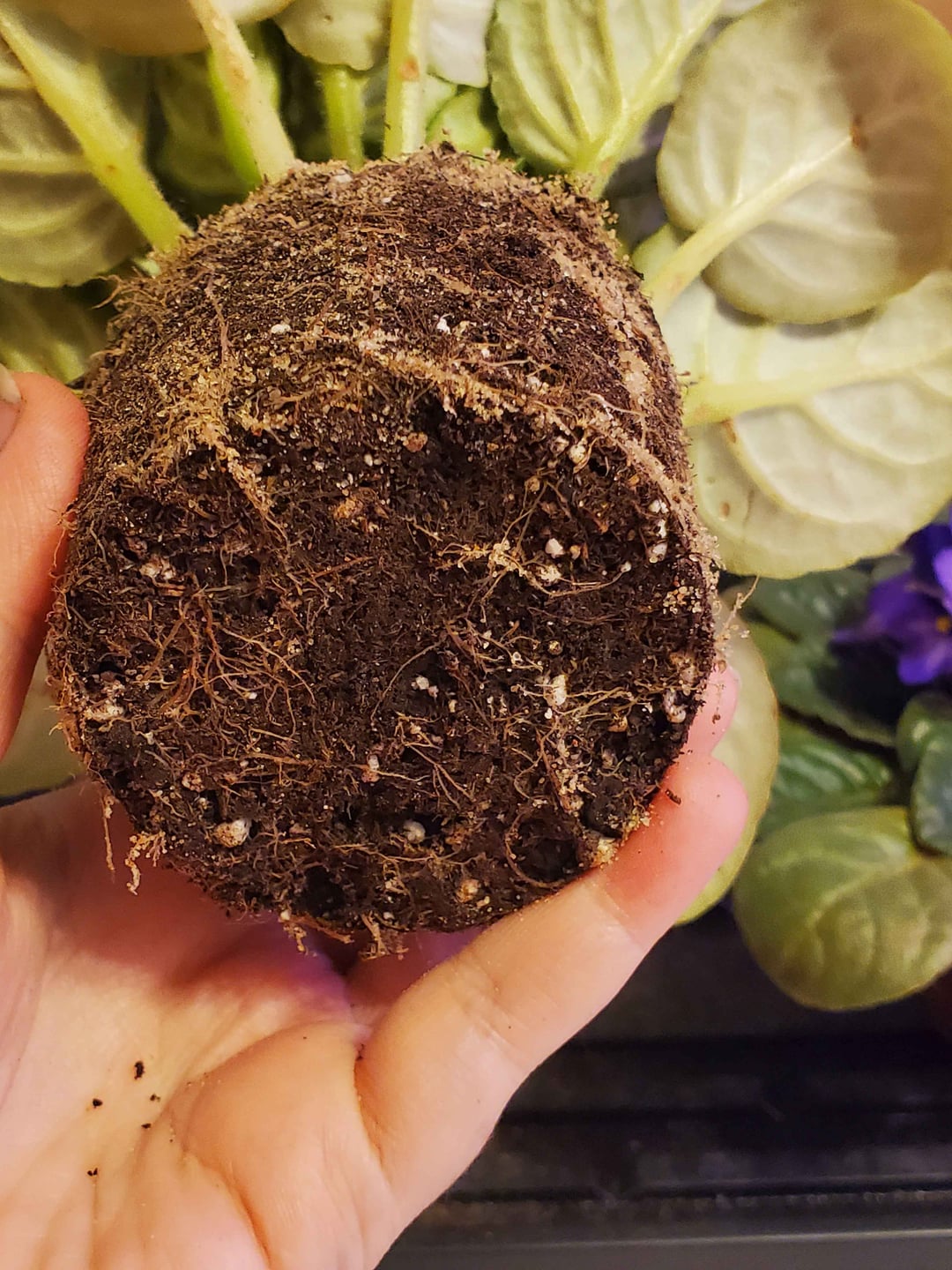 Hello! Got these violets several months ago, read about the watering habits, how they like to be slightly rootbound. First three pictures are of the purple flowering one, the rest are of the other one. I do have sand on top of soil to discourage gnats from laying eggs in soil, so if you see weird coloring of the soil that may be why. I water then around twice a week I've noticed if I go a week or more the leaves start drooping. Yeah I need to remove the spent flowers on the pink one, will be doing that this week. The item info I took a picture of says it's a 4in pot. The roots are basically the same in both. Also, I want to check I keep them under growlights for around 16 on 8 off. Should I do less, I've noticed the outer leaves changing color and wonder if I need to change lighting setup. Thanks for the input 🙂