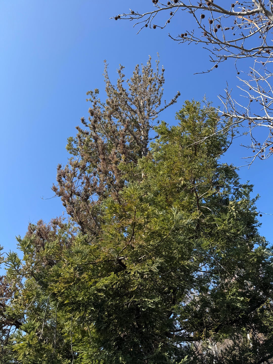 I have a 25 year old redwood that looks great on all sides except for the top half southeast facing side which appears sparse and needles seem to be dead and color of brown/white. Located in Livermore CA