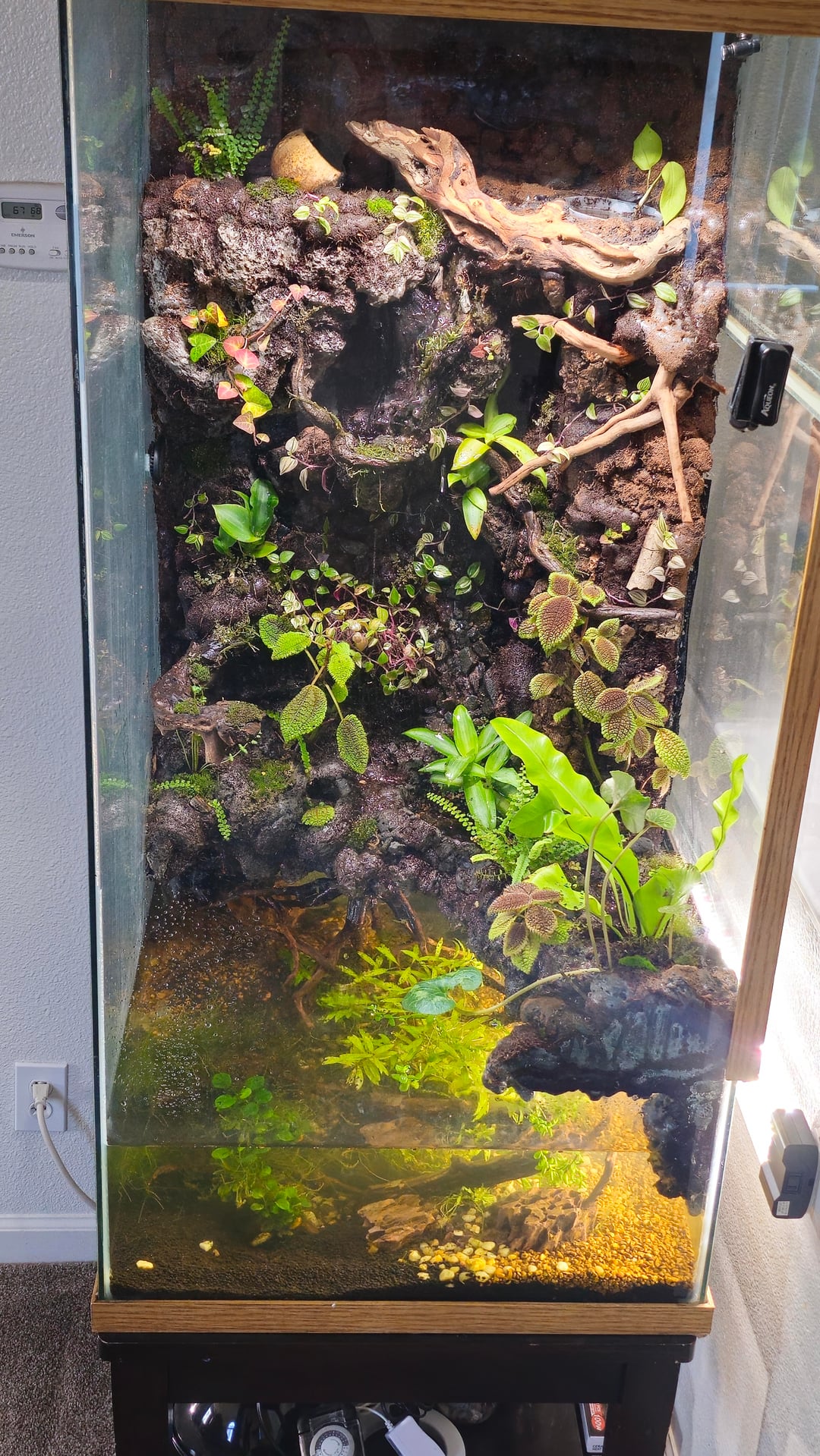 So its a 4ftx4ftx2ft paludarium with abt 20 gallons of water. Before now I kept a few aquariums with cool fish species, dumpy frogs, and years ago I had a leopard gecko, but don't plan on stocking anything in here till I know what would be best suited. I also have a few kinks to solve first before putting any living critters in here.