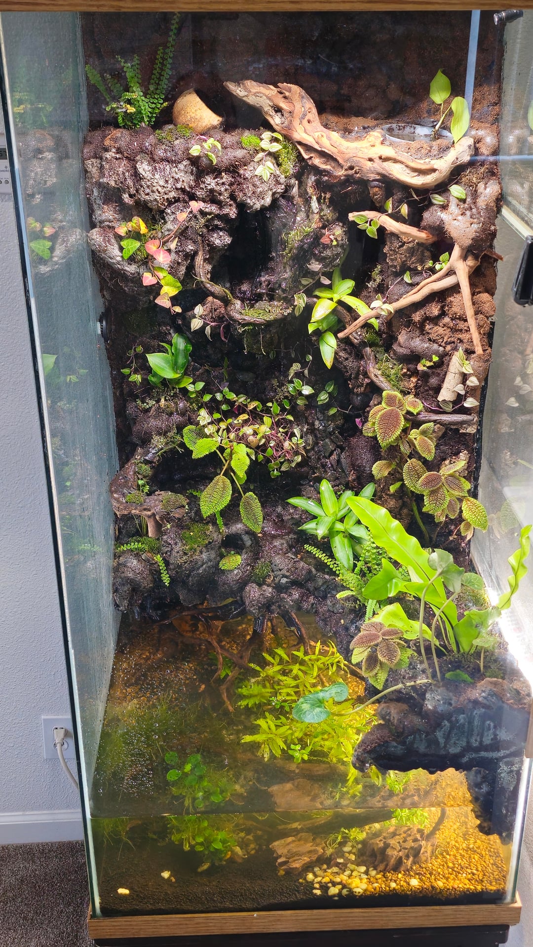 Yes I know not a lot of options with this much water and limited food options but I am serious about it, just want this build to be more peaceful over high maintenance. Depending on species I pick to keep in here I'll probably need to do more work with branches, large floating plants etc for drown risk prevention, and id also be maintaining water at the ledge level.