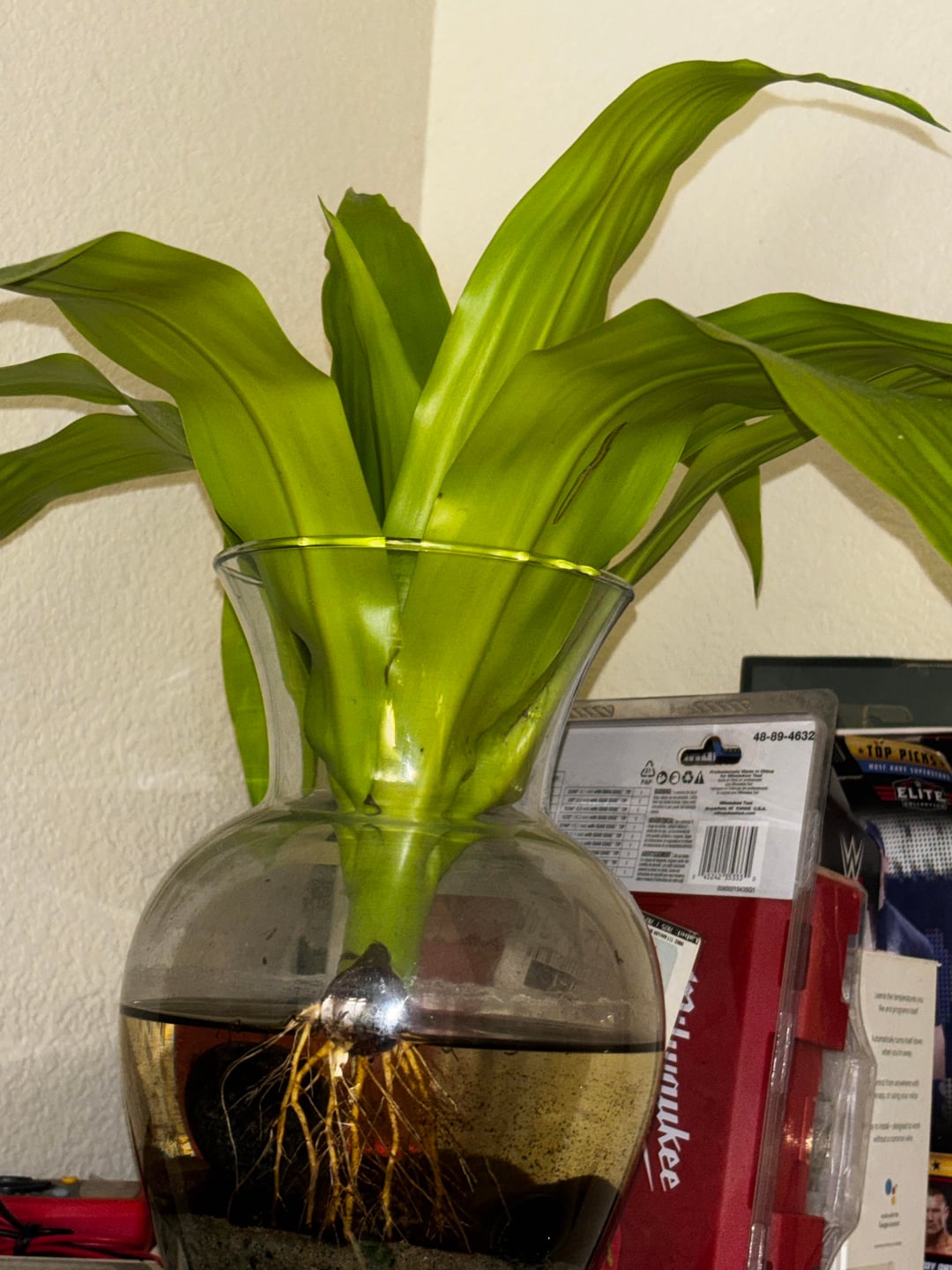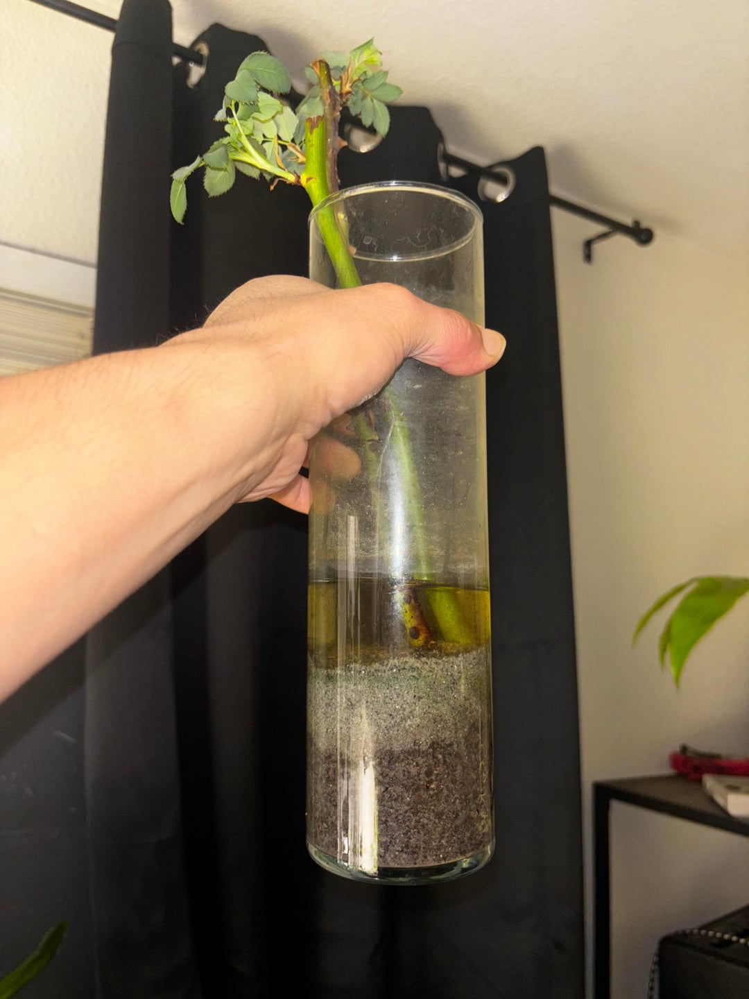 everyone here I always notice is always so fixated on having clean water and doing water changes whenever you see cloudy or murky water yes I would agree but if you can find equilibrium for your cuttings in their environment they root faster i find and you don't have to pay much attention to them at all. actually I just don't even think about them and just come back weeks later to roots. To find that equilibrium balance here's how I do it. I go into my backyard and find dirt growing near plants where the sun doesn't dry up the soil all the way it stays relatively moist because that's where I figure the most amount of bacteria are colonizing within that dirt. so what I do is I collect that moist soil and I put it on the bottom of a vase and then on top of that I put a layer of sand to keep it from mucking up the water then I gently pour in rain water that I've collected and then I look for a container that is infested with cyano bacteria and then I pour that in with the rain water. After that I just add whatever cuttings so far I have rooted rose cuttings, dracaena lime light, and I have a rooted brugmansia but brugs are a given they're very easy to root regardless. all I'm saying is bacteria should not be villainized it can work to your advantage. you just want to make sure the water within the containers are exposed to adequate light every day and in turn that cyanobacteria doesn't grow out of control because of all the other bacteria living in the container they all keep each other in check and personally I think it reaches equilibrium. providing a hospitable environment favorable for your props the cyano bacteria create oxygen as long as they're exposed to light and the mixture of soil at the bottom provides natural food to your cuttings if the water gets too low that's the only time I add water. The rose cuttings inside the vase I'm showing you I've never even added any new water to it. Thank you for coming to my TED talk