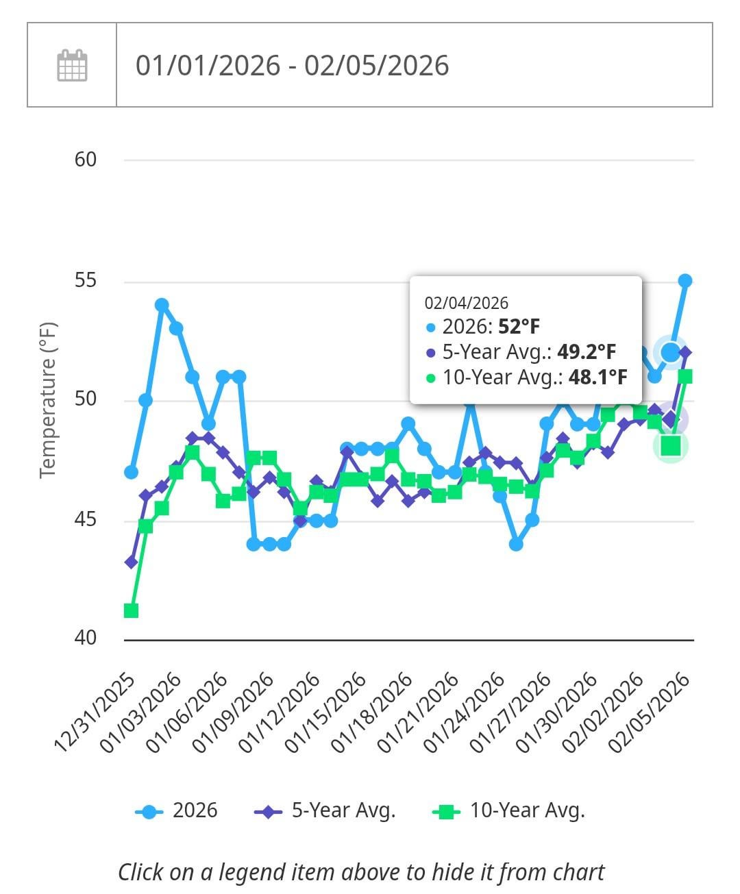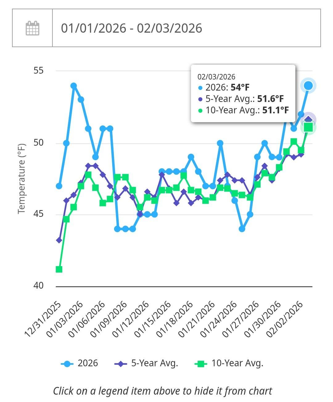I checked greencast Tuesday 2/3 and was surprised to see the soil temp at 55F on the graph(and~60F as the current temp). Threw my preemergent down on Wednesday and checked again, and noticed it said the temp on 2/3 was 51F, but the current day was 55F. Today I checked and it again said the current day was 55F, but the previous two days were 51/52F.