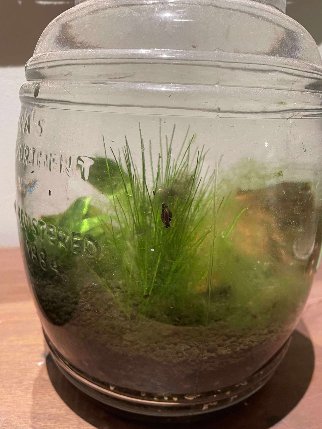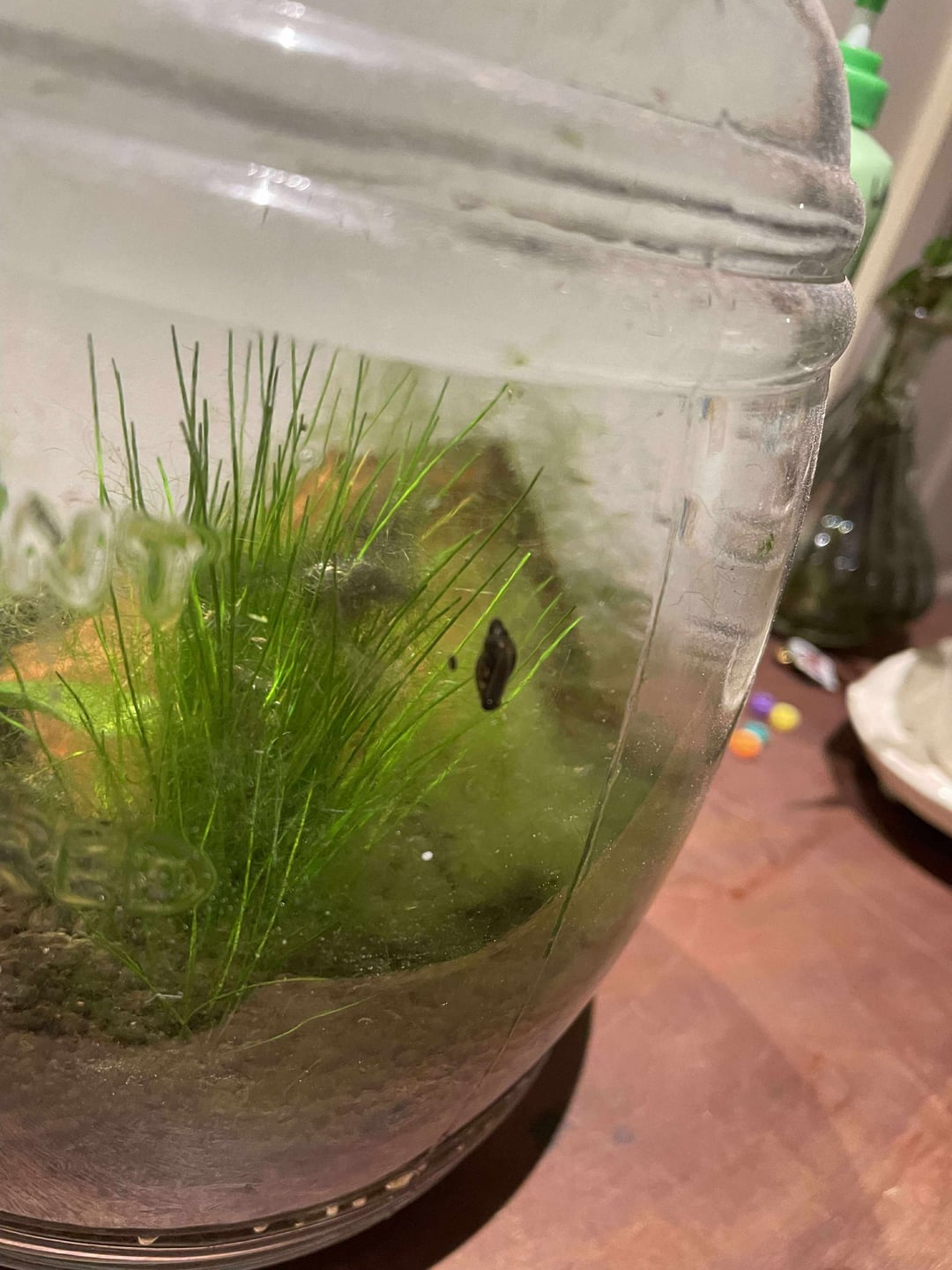 I hope the image is clear enough. This is my second jarrarium, I'm very hands off with them, but gave them a top up before I went away for a few days. This one, in addition to the algae, has got these strange black things crawling along the inside of the glass. They've definitely been in there for a few weeks. Does anyone know what they are? They have antennae. This jar was outside for the last few months so I'm concerned it's either a) leeches or b) tadpoles. Located in Melbourne, Australia.