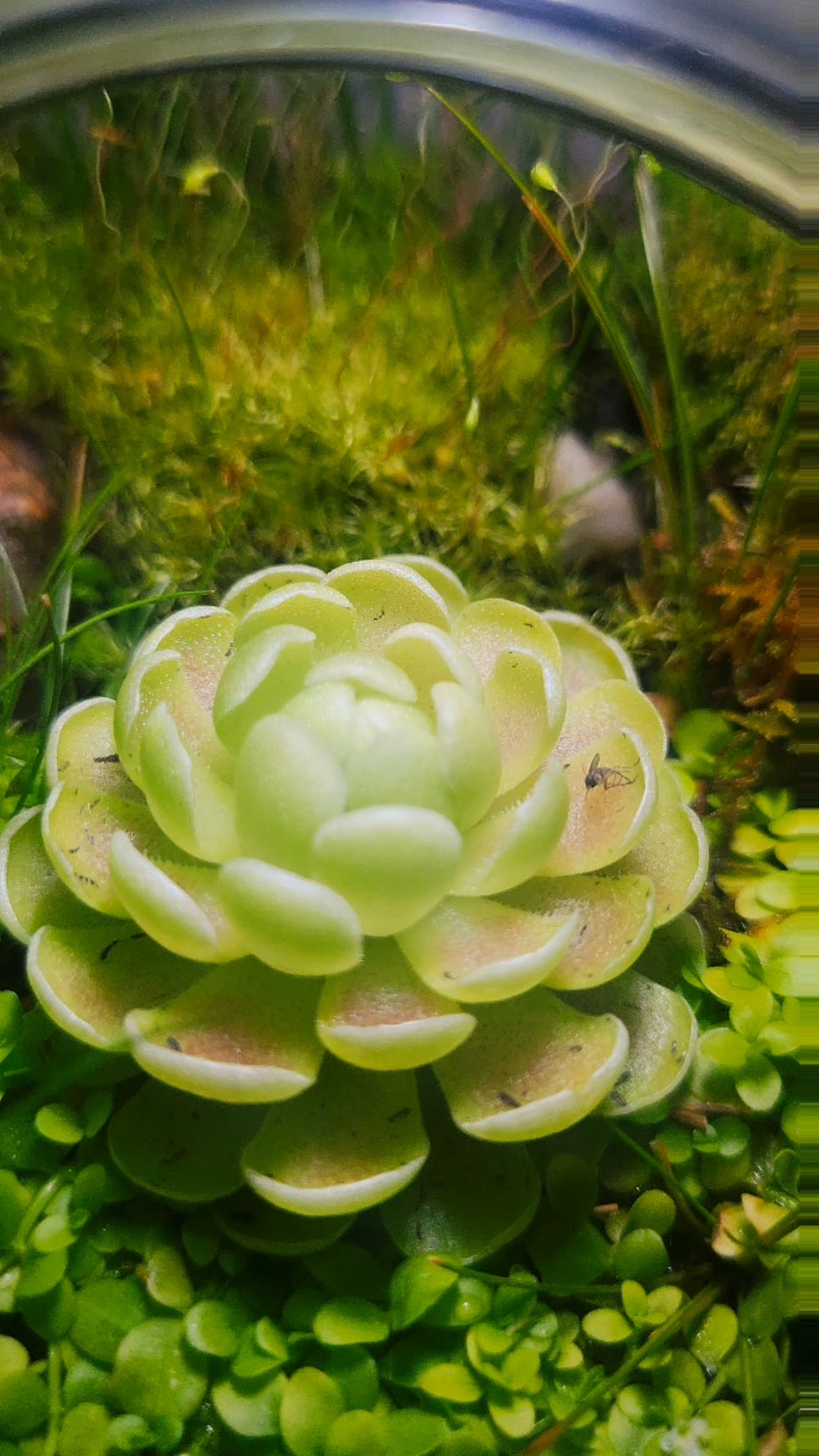 Ping esseriana feeding. I love this plant in my nano terrariums because they thrive in humidity and for their obvious built-in pest control. Other plants are micranthemum (jar is very humid and oriented so the front/lowest stays soggy) and moss. Small mostly covered globe jar with lava stone pebble base, some dirt and sand under a cheap 15w white LED.