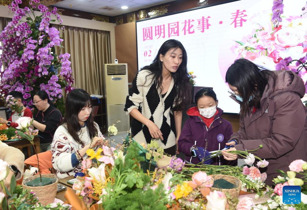 People experience flower arranging with the guidance of a teacher during a Spring Festival garden party at the Old Summer Palace (Yuanmingyuan) in Beijing, capital of China, Feb. 7, 2026. The four-day Spring Festival garden party opened here on Saturday. (Xinhua/Luo Xiaoguang)