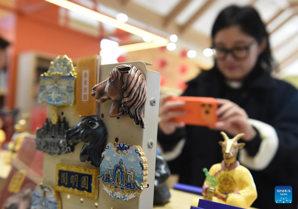 A visitor takes photos of cultural and creative products for the Year of the Horse during a Spring Festival garden party at the Old Summer Palace (Yuanmingyuan) in Beijing, capital of China, Feb. 7, 2026. The four-day Spring Festival garden party opened here on Saturday. (Xinhua/Luo Xiaoguang)