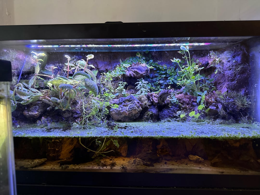 It’s has ~10 species on the land and water. I just trim the plants and add some shrimp pets every few weeks. It’s meant to house a vampire crab population but I haven’t gotten around to putting them in there yet. by Equivalent-Glass-615 paludarium 2 Comments Lovehat 20 hours ago Love it! QuoteFabulous2402 14 hours ago “self sustaining” ?? There is no such thing😏