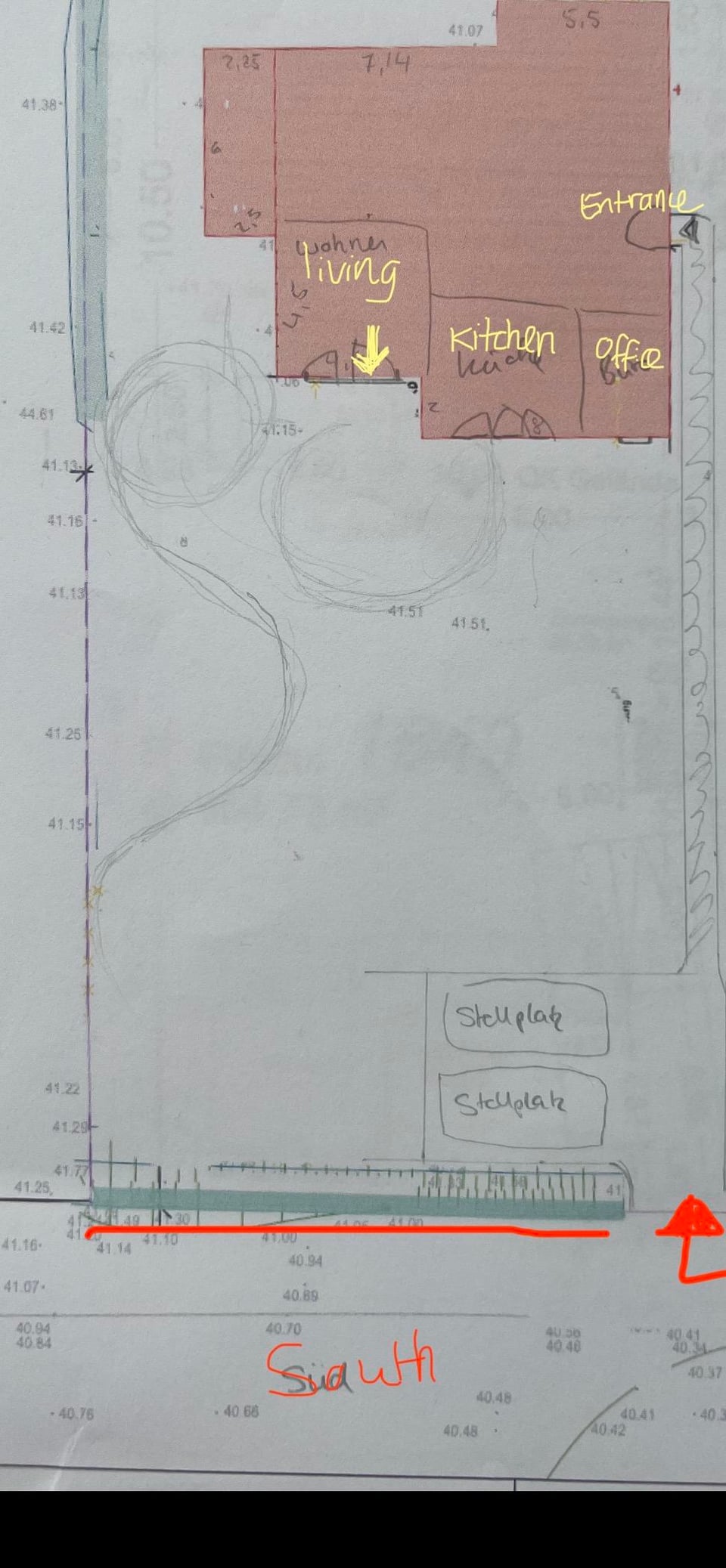 – having the parking (carport) and driveway only at the south end leaves the rest of the garden nice and open. The view from the office isnt blocked. you would also be able to fence the entire yard leaving out the parking and would be able to leave the dog in the yard safely. downside: the cars aren’t inside the fence and more prone to being stolen. Also the walk from the car to the front door is a little farther.