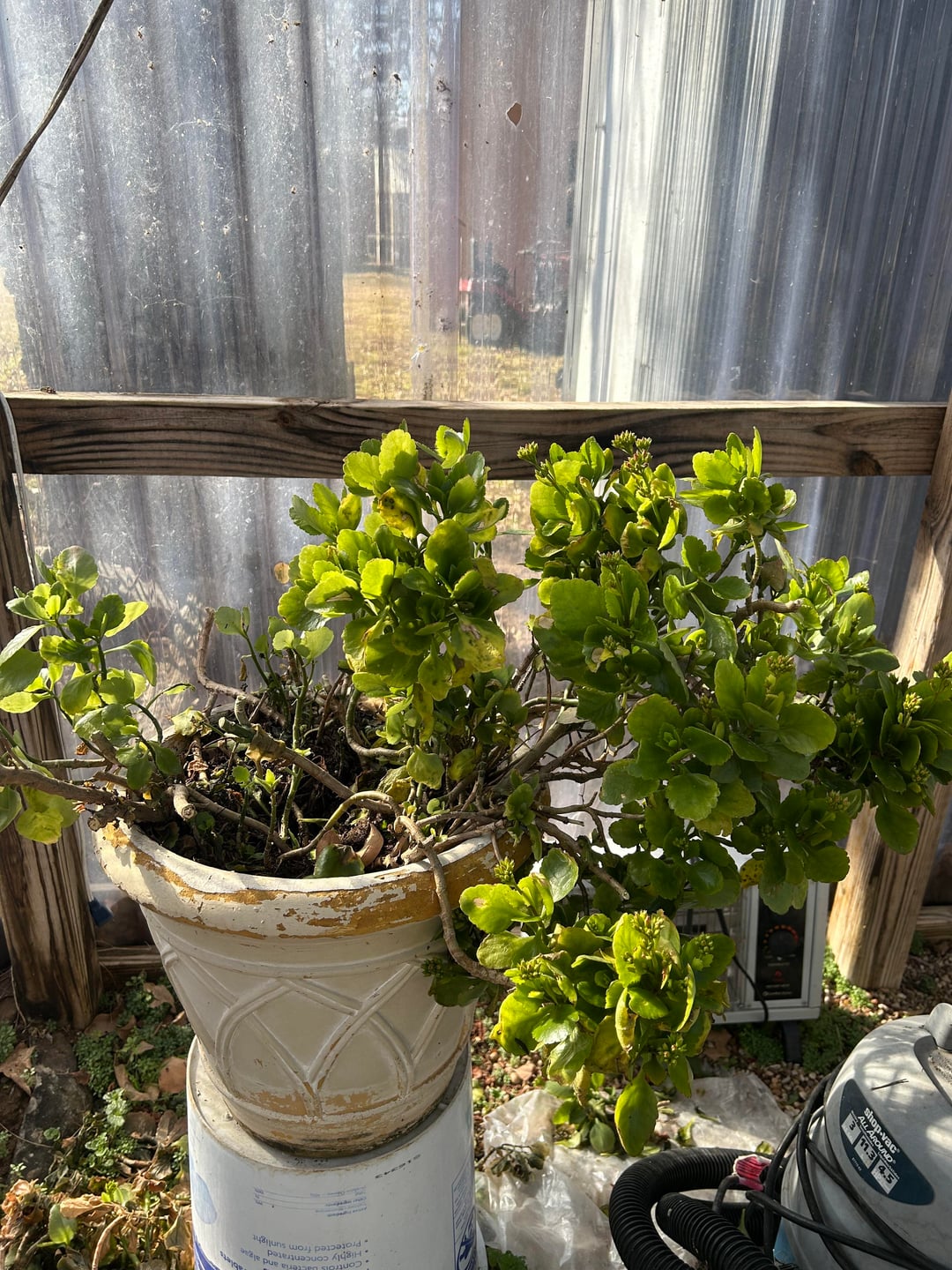 Kalanchoe blossfeldiana, if you can give her 12 hours of *complete* darkness overnight for about a month she’ll give you some GORGEOUS flowers 🙂
