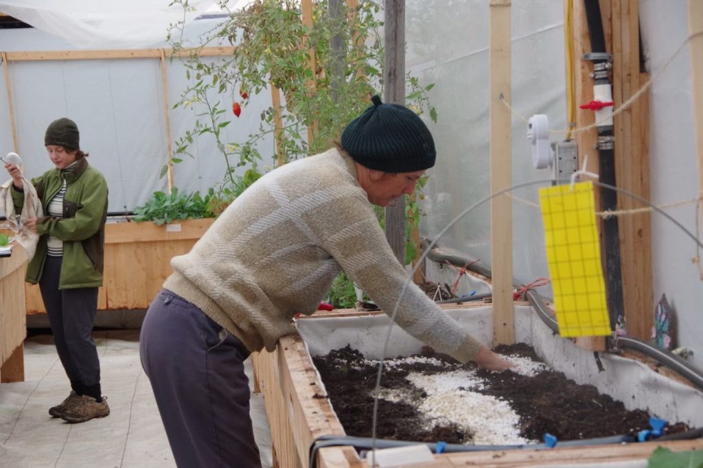 Garden coordinator Karine LaPointe and intern Vanessa Johnston check conditions and prepare soil in the walipini. Photo by Mira Dietz Chiasson.