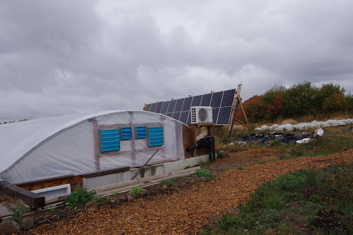 The solar panels and batteries are only part of the solution; tarps and a space heater have also been required to help keep the ground from freezing during the coldest days.