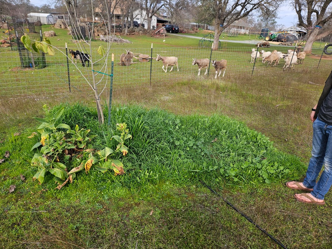 This little rectangle of land is no different in any way from the land around it except that I placed a load of goat/chicken/sheep poop from their yard and placed it here this winter. The unfertilized plants are sparse, small, and stunted while the plants that were fertilized are thriving (except the tobacco which fell over and hates the cold).