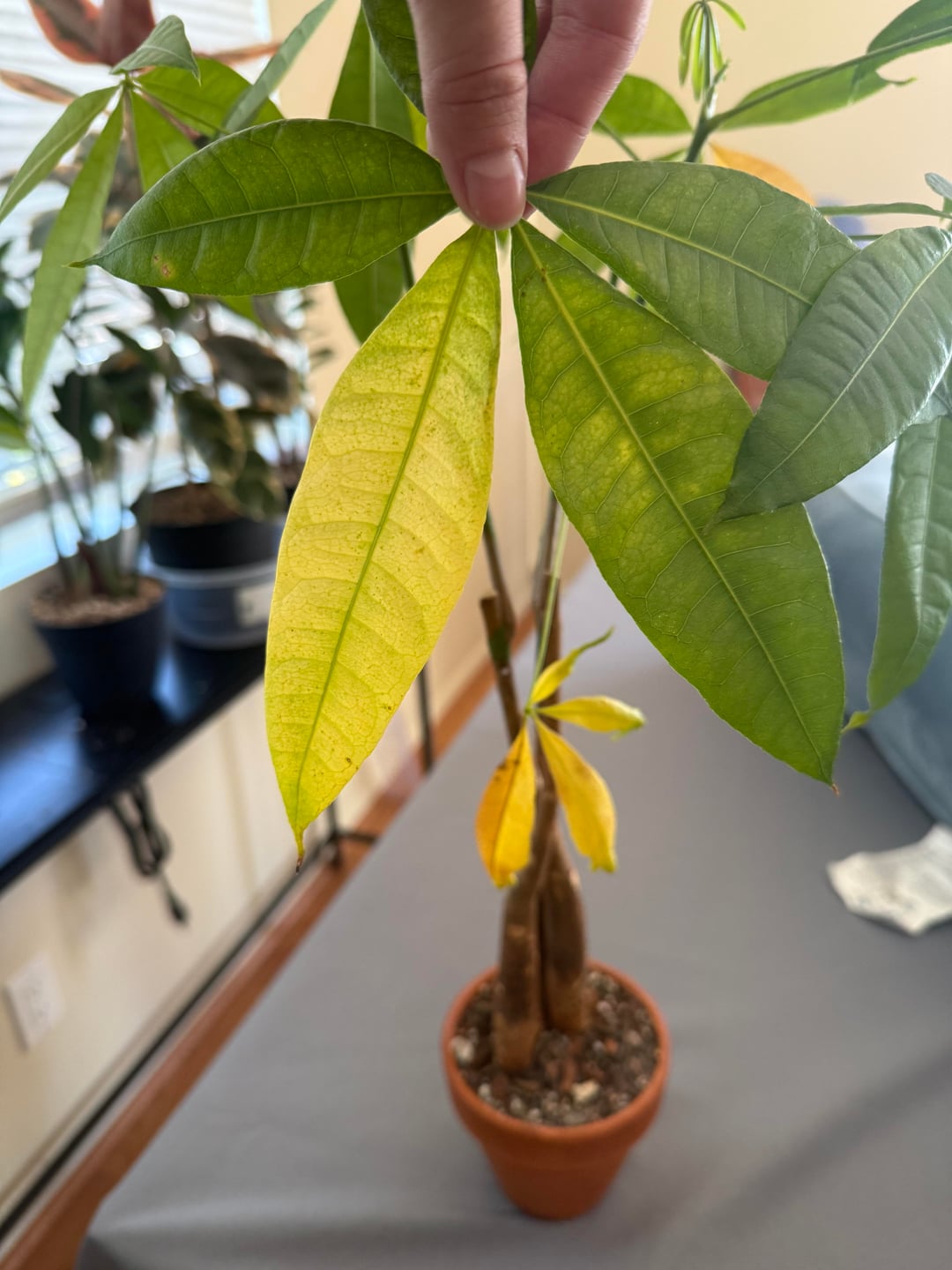 Hello! I’ve had two small money trees for around 2 years. They’ve always been struggling, then fine, then struggling. This past week the larger tree has had a sudden surge of yellowing, with some odd browning with it. It is affecting leaves on all three trunks. I moved in May, and 2 ish months ago I moved it out of the mostly direct sun of the window and to a bright but indirect spot. Main tree is in a chunky mix in a terracotta pot, and I only water when dry (if I had to guess, every two weeks?). I don’t think ac drafts touch it at all. Wondering if it’s fungal? Pictures 1-2 are the tree in question, picture 3 is my second tree with one stem that has a bit of a weird yellow pattern. Need help on the main tree but figured I’d add a picture of the second tree that lives next to it. Thank you for any advice or tips in advance!!