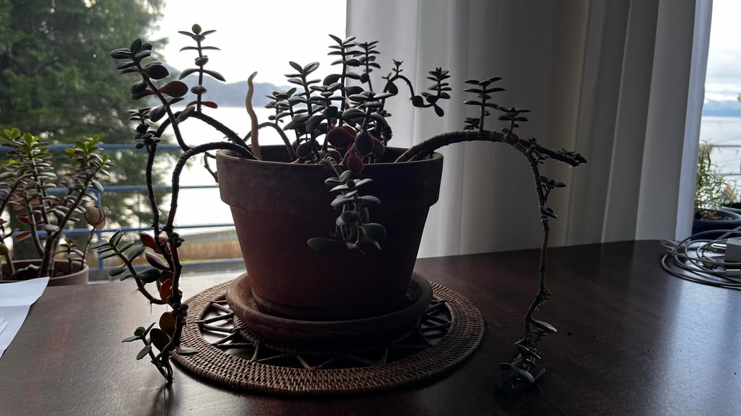 Got this as a sad, sick jade plant over 10 years ago. It was covered in milly bugs, but I saved it from those mean little guys! Now after several moves and happy dog tails right at plant-level, it looks really funny. Open to suggestions as to what I should do. Otherwise, the plant itself seems pretty healthy.