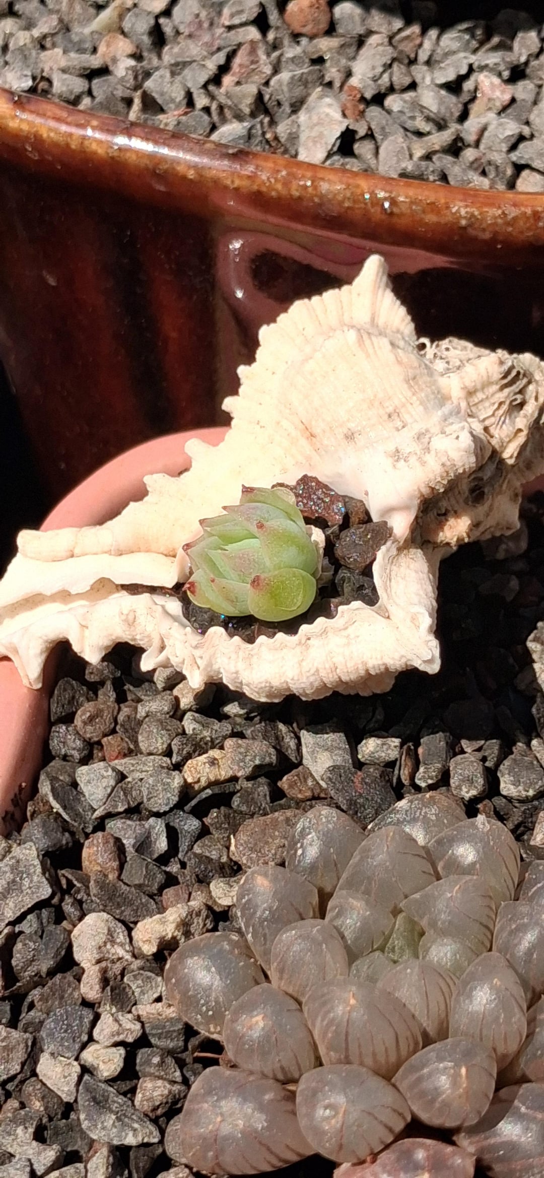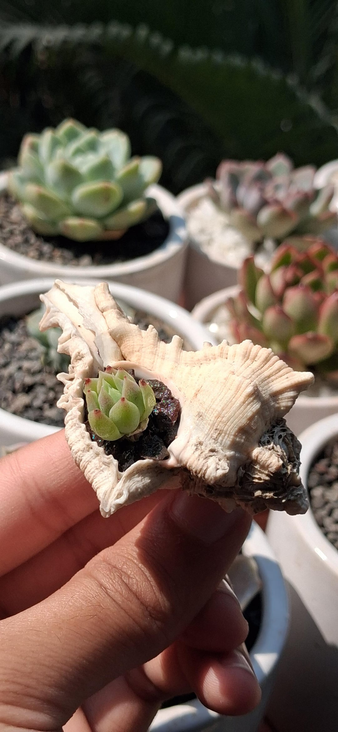 Very nice idea to grow them in conch shells. Recently I saw epiphytes grown in large snail shells on youtube which seemed really cool.