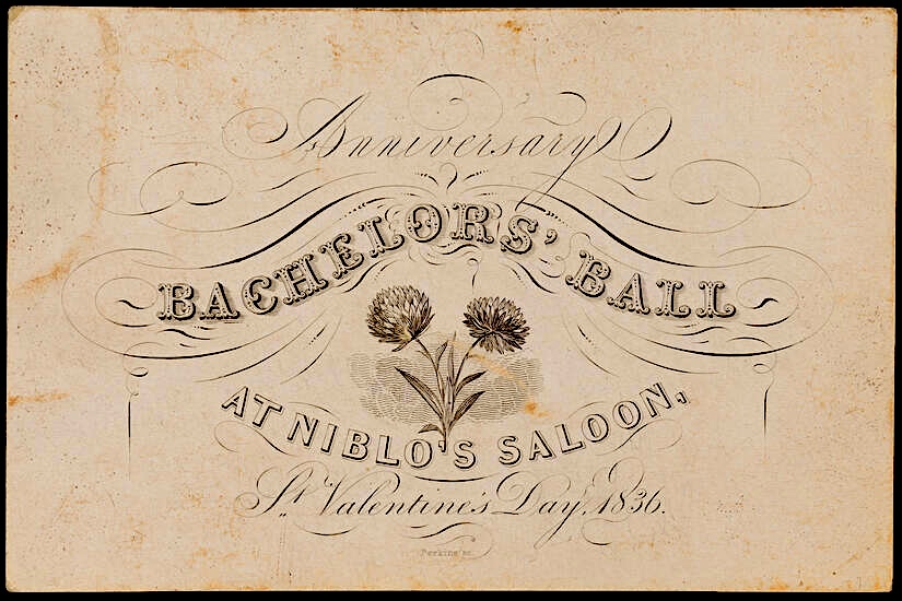 This swanky event was held every February 13th or 14th, first at the posh City Hotel beginning in the 1820s and then a decade later at Niblo’s Saloon—a theater that was part of the popular Niblo’s Garden pleasure ground at today’s Broadway and Prince Street.