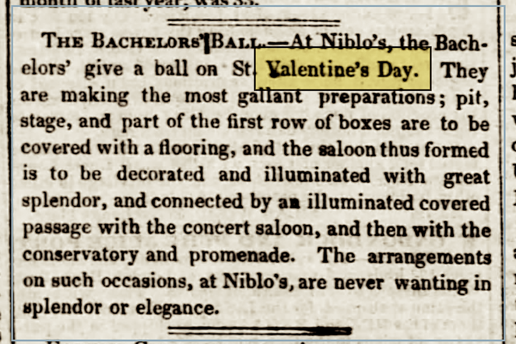 “These are the results of the Bachelors’ Ball; therefore, sweet ladies, prepare your brightest smiles for St. Valentine’s Eve, and be determined, on this jocund and interesting occasion, to select, cautiously but firmly, the men worthy of your hearts and hands, for, on that night, many are the contracts made, which last for life, for weal or woe.”