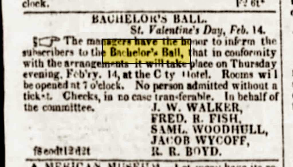 Holding the balls on Valentine’s Day really underlines the ultimate goal of turning single men into husbands. In an article about the Bachelors’ Ball of 1842, the New-York Mirror weirdly summed up the yearly event this way: