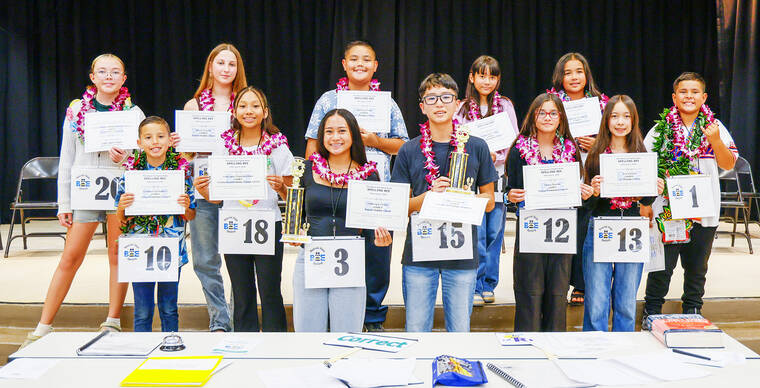 Participating spellers in the Kauai Complex Area Spelling Bee — which meant they earned their position by winning their respective class and school bees — include Isla Smith (grade 5) and Cian Duffy (gr. 7) of Alaka‘i O Kauai Public Charter School; Francesca Dasalla-Astero (gr. 6) and Kourtney Lopez-Duffy (gr. 7) of Chiefess Kamakahelei Middle School; Jhayrmiyah Yoshimoto (gr. 5) and Madeleine Young (gr. 5) of Eleele Elementary School; Lael Koopman (gr. 4) and Evy Penhallurick (gr. 5) of Hanalei Elementary School; Canon Jung (gr. 6) and Ethan Irimata (gr. 8) of Hawaii Technology Academy; Matarangi Kitashima (gr. 4) and Emma Benton (gr. 5) of Kapaa Elementary School; Makenzie Abalos (gr. 8) and Khloe Coviello (gr. 8) of Kapaa Middle School; Kailana Butay (gr. 4) and Amaya Pinder (gr. 5) of Kekaha Elementary School; Elijah Igne (gr. 4) and Cameron Kaneshiro (gr. 4) of Koloa Elementary School; Anthony Riola (gr. 6) and Irie Abalos (gr. 8) of St. Theresa School.