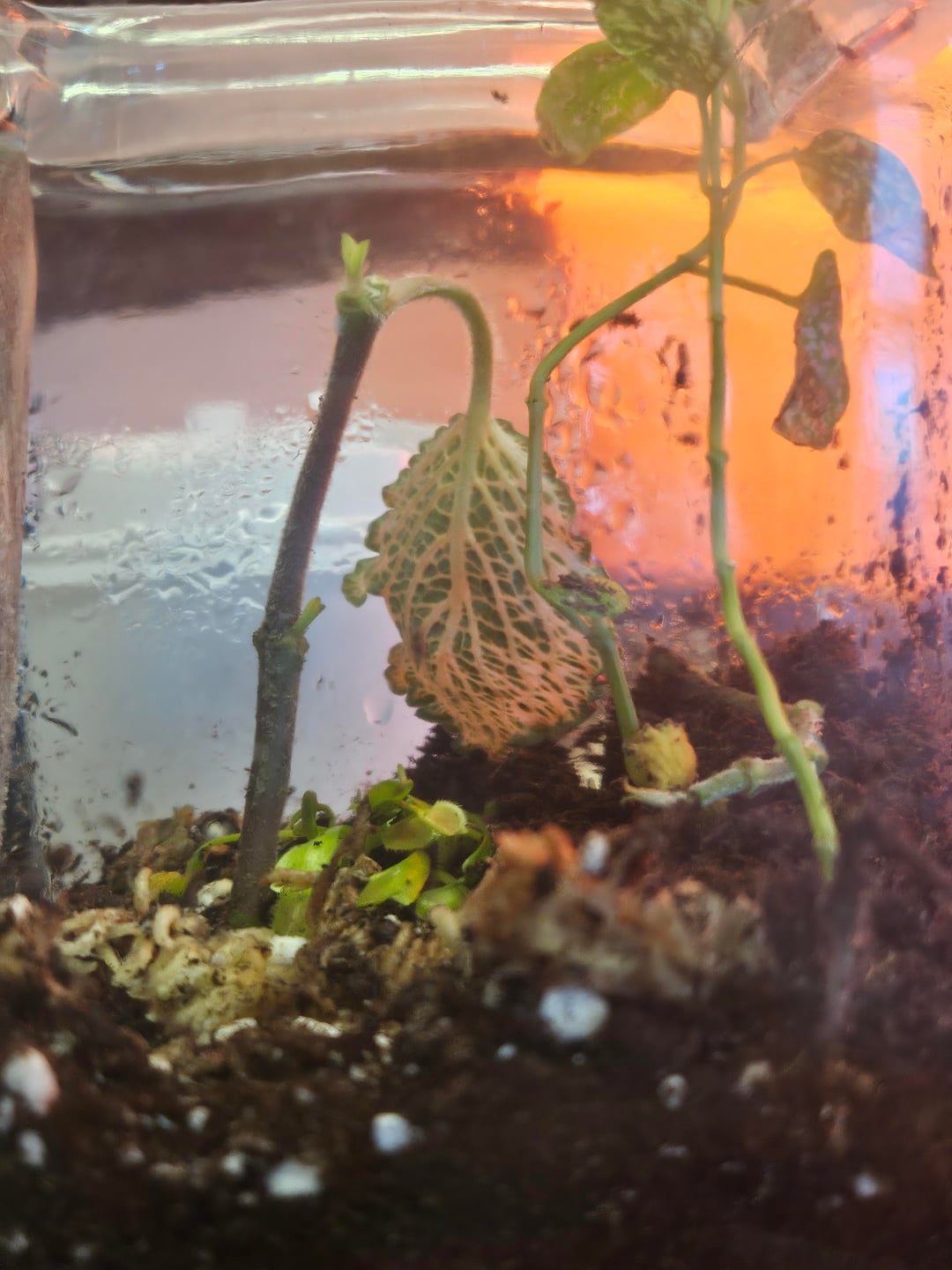 One bad thing that happened is that one of the two fittonia stems rotted off. Which i remember someone mentioning in my first post. So what I did is cut off the rotten part of the stem and places the remainder in the soil, just to see what happens.