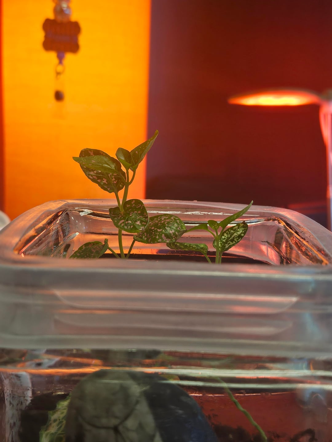 I left it alone at my desk under a timed grow light for the weekend, I HAVE BABIES. THE FITTONIA IS GROWING!! The polka dot plant burst out the top and is growing as well!! The tiny VFTs are also doing well. Overall, I'm hyped af!! (first picture is when I started, the other three are the updates)