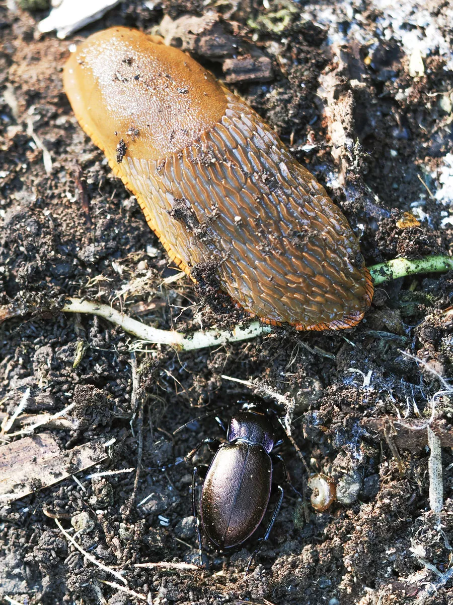 What about all the variously sized black beetles that are also found under those same boards? Garden friend or foe? Very good friends. The snail-killer carabid (Scaphinotus angusticollis), European ground beetle (Carabus nemoralis), and night-stalking tiger beetles, have come by their names honestly, with both adults and larvae being predaceous on slugs and other pests. The snail-killer carabid, for example, is a specialist in killing and eating slugs and snails. Compared to other beetles, it has narrow jaws, head and shoulders that allow it to squeeze deep into a snail shell to dine on fresh escargot.