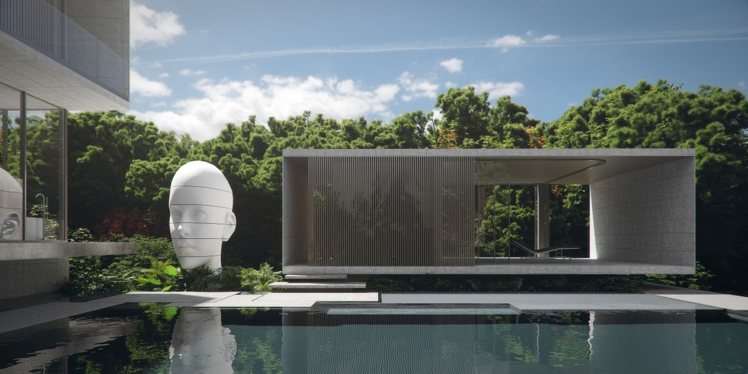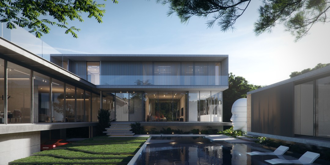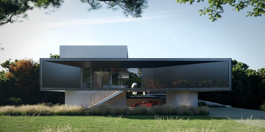 The architectural language is composed of elevated concrete volumes and suspended glass planes. Horizontal forms establish stability, while vertical screens filter sunlight and soften exposure. The house appears simultaneously grounded and floating, communicating permanence without heaviness. The spatial sequences encourage slow movement and introspection, guiding inhabitants through moments of compression and release. Architecture becomes a spatial script where protection and perception continuously interact.