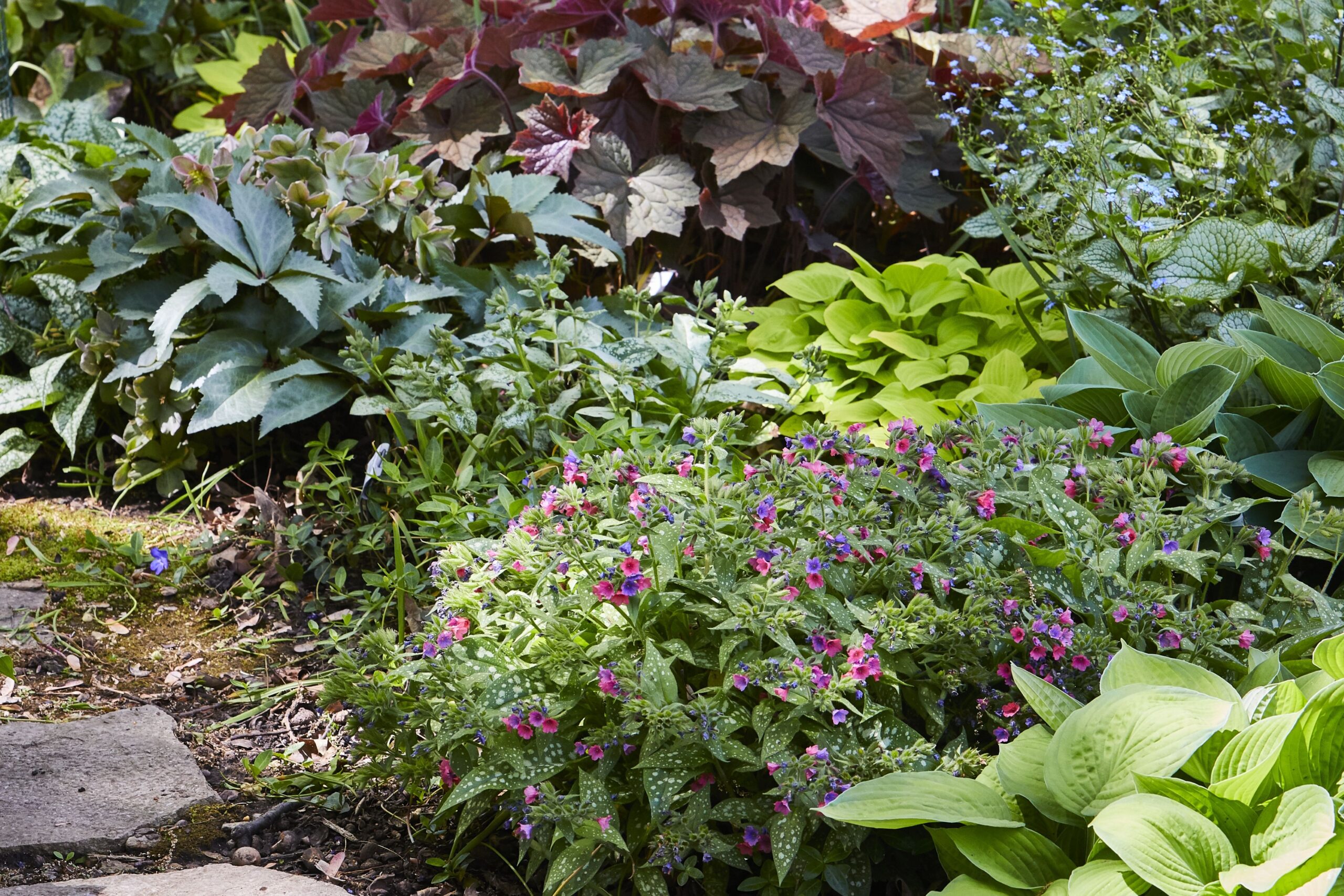The whimsical spotted foliage of lungwort (Pulmonaria spp.) lights up the shade garden from spring through fall. The flowers of this low-growing perennial, in shades of pink, blue, and purple, fare best in cool weather and pair well with spring bulbs such as hyacinth and glory-of-the-snow. Deer and rabbits don’t bother it. Test Garden favorite cultivars include ‘Shrimps on the Barbie’ (shown here), ‘Spot On’, and ‘Twinkle Toes’. Zones 3-8.