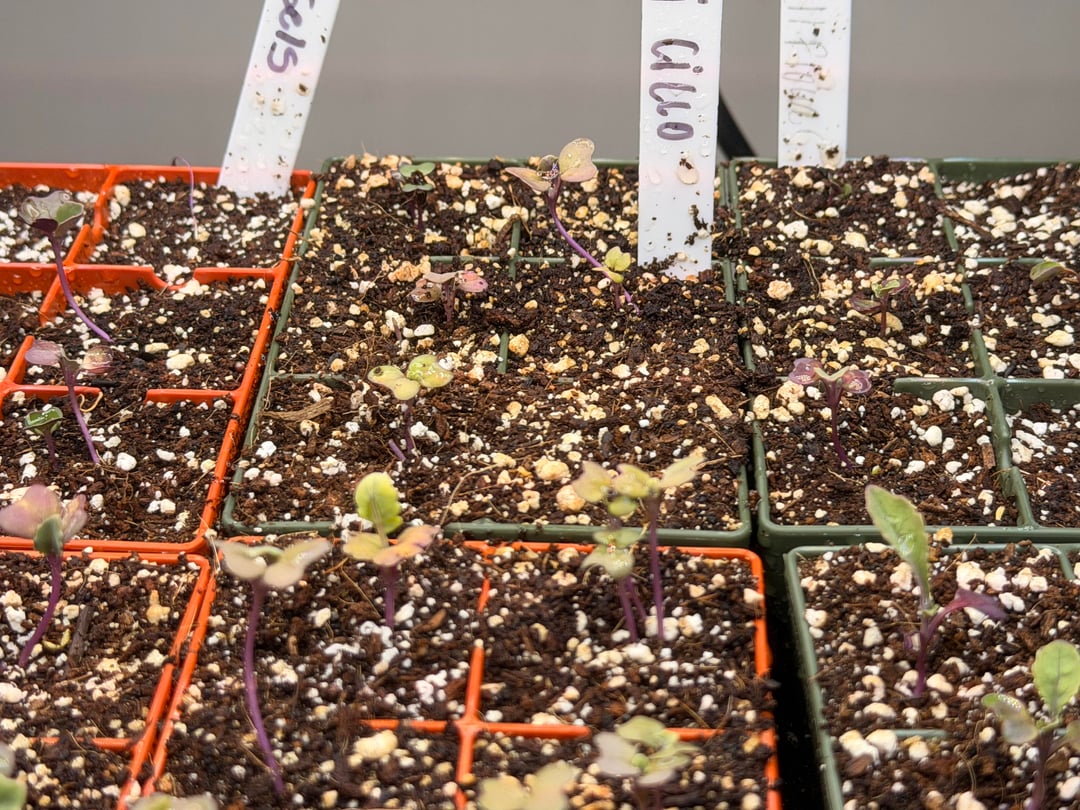 In a mix of cococoir, perlite and earth worm castings. All brassicas and onions planted 22 days from now. But not much have changed. All situated under a Vivosun AeroLight that’s 9-10 inches from soil. Should I be more patient with brassicas and onions? The onions look as if they are reaching for light. And the brassicas are yellowing despite proper watering.