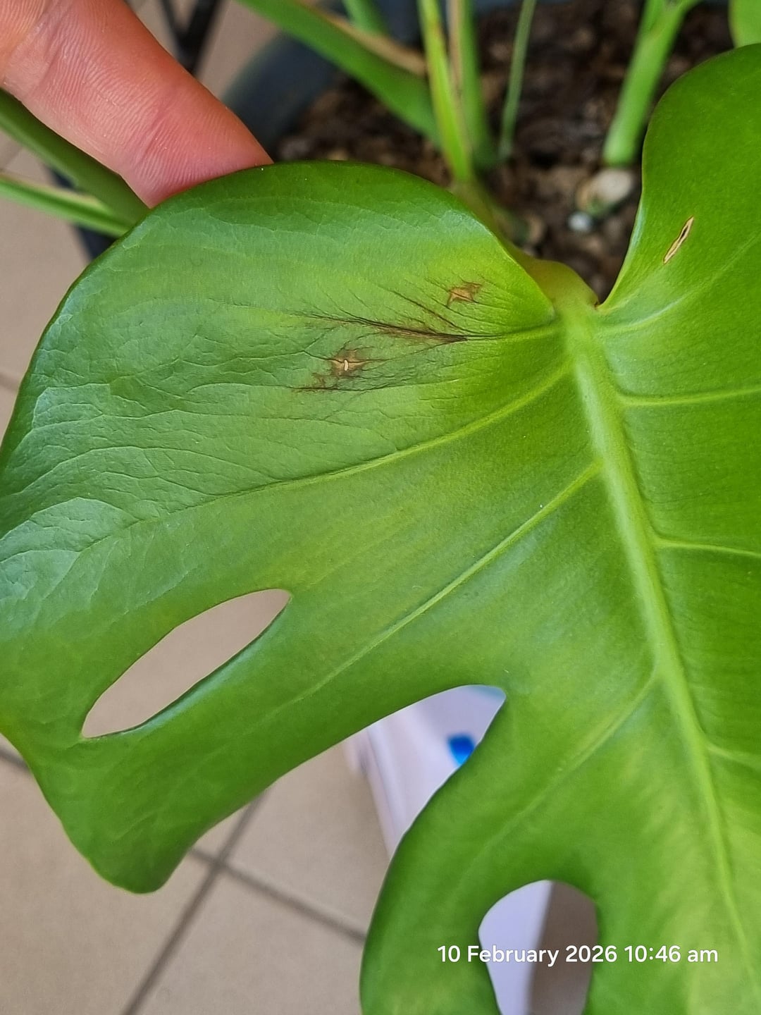These brown, crispy spots with yellow "halos" have appeared on 2 new leaves that sprouted from the area where I propagated her a few months ago and today on another older one..