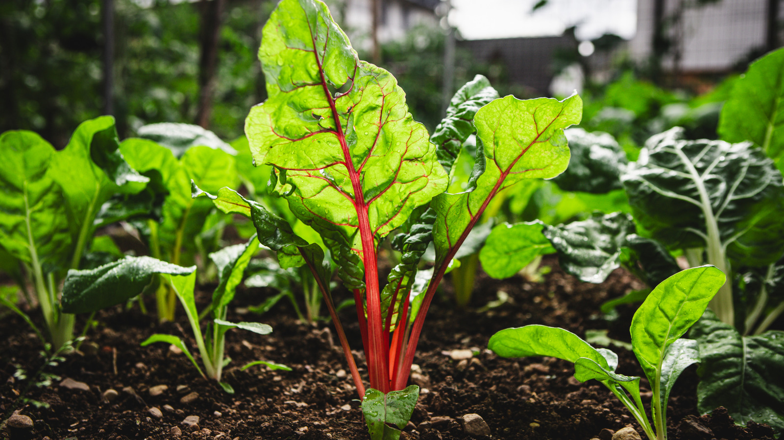 A close-up of Swiss chard growing in a garden