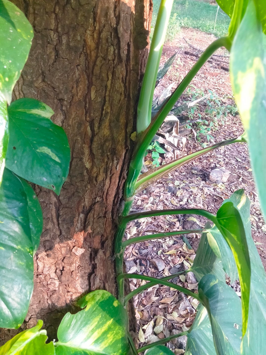 But to explain what’s happening, when this plant begins to grow vertically and the nodes connect to a tree a hormone is released that starts the maturing process. As it grows up the tree the leaves get bigger and bigger to receive more light. They even start fenestrating (holes in the leaves) the plants do this to reach maturity and flower once the get higher In the tree. Tho for some reason pothos have not been observed flowering unlike other aroids plants.