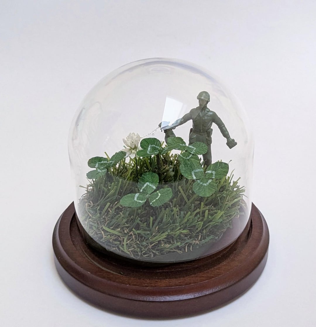 "Are You Feeling Lucky? II" is 4x5x5" and displayed in a glass dome with a wooden base. The clover and clover flower are painstakingly handmade with crepe paper, paint, wire, and pigment. The green army man has been sculpturally altered so he now wields a spray bottle of herbicide.