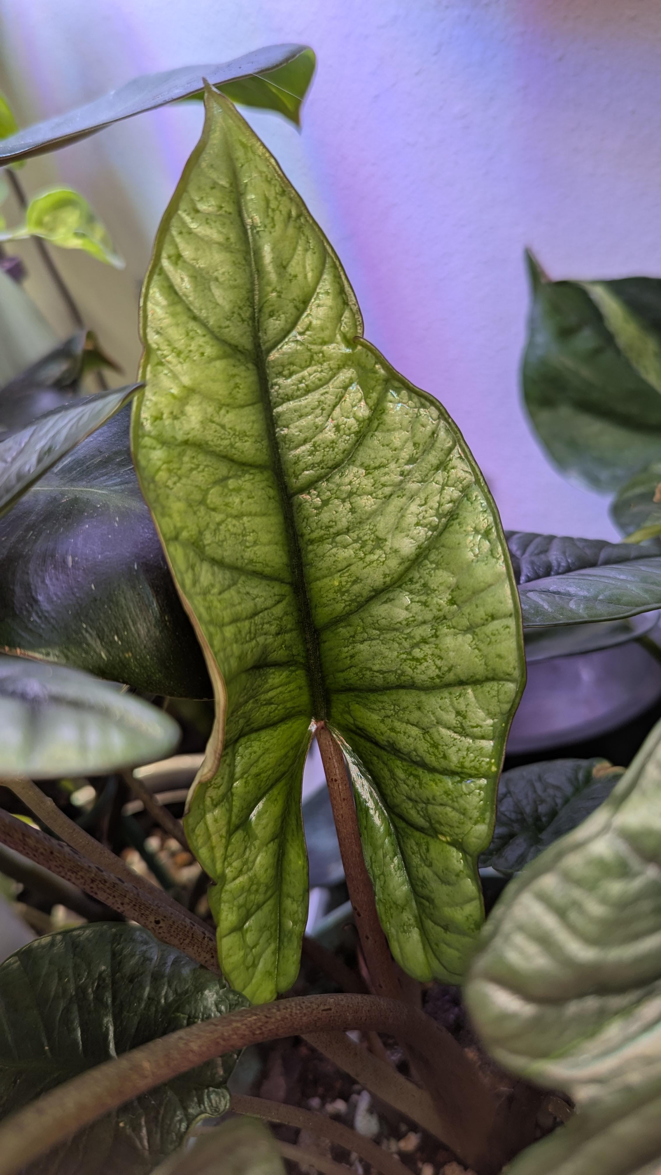 Hi everyone! I found this Bisma with a morphological mutation about 2 months ago and I'm wondering if anyone has seen anything similar. there are 4 growth points in this pot, and they all have the same form so it appears to be pretty stable. This is the newest leaf, and still needs to harden, but the pale colors help to see the texture.