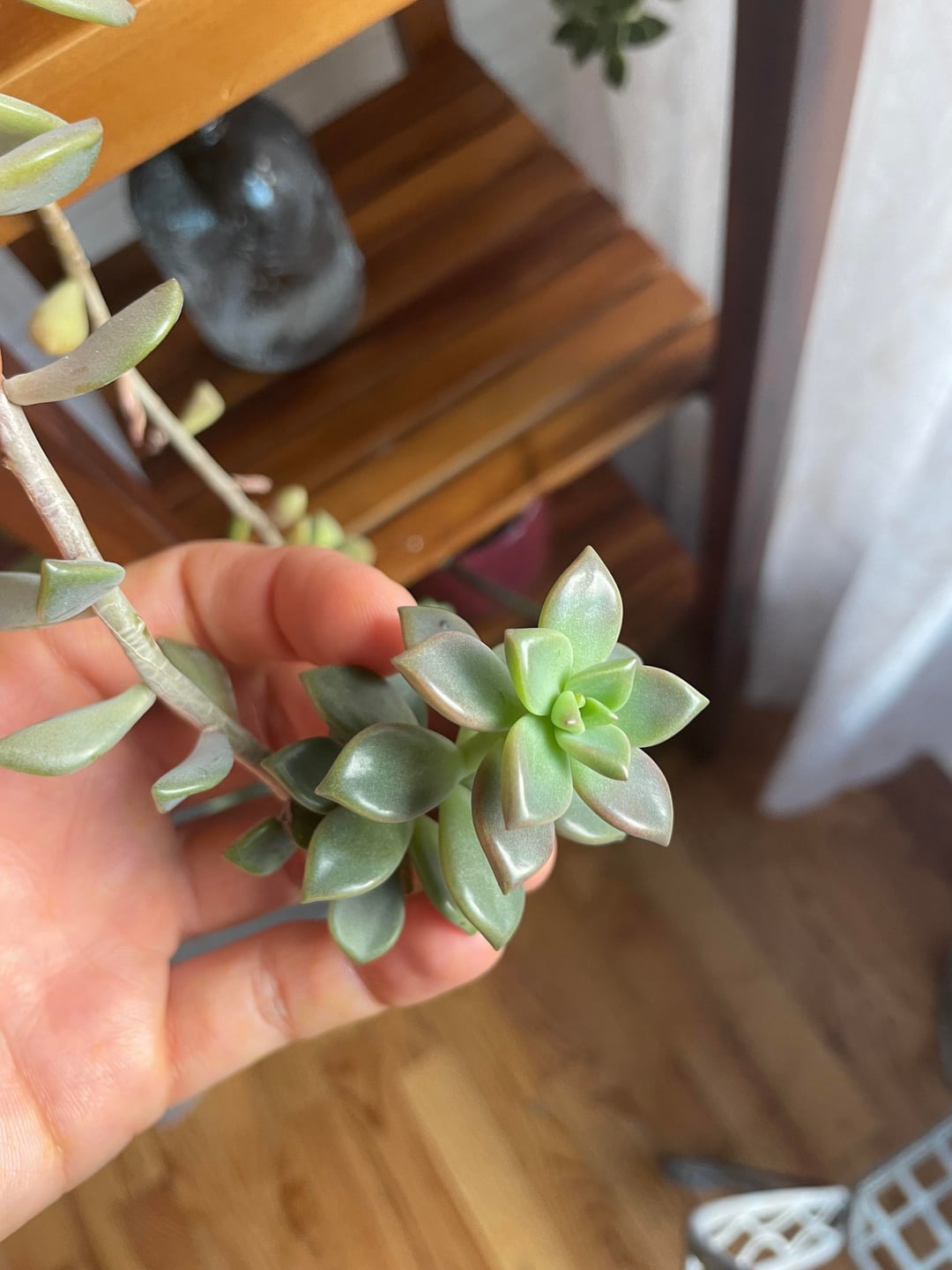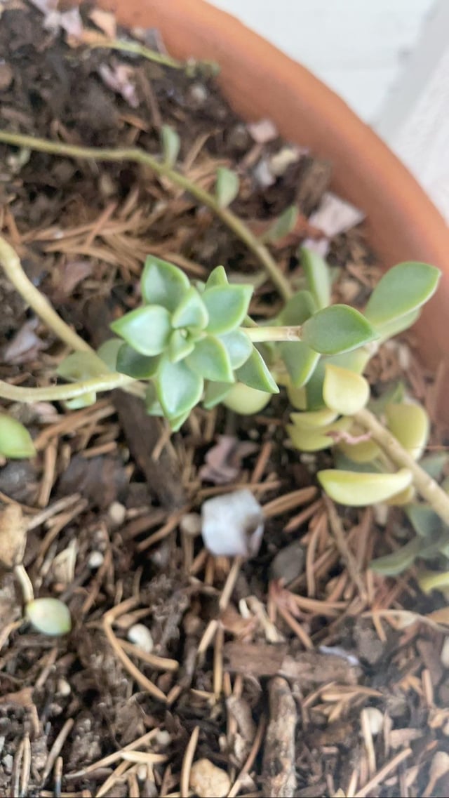 I inherited this plant from a roommate and would like some help identifying it. It’s planted in the same pot as a jade. Things that I’ve looked at online but don’t look quite right are Burro’s Tail, Shimmering Rose, and Ghost Plant. Thanks in advance!