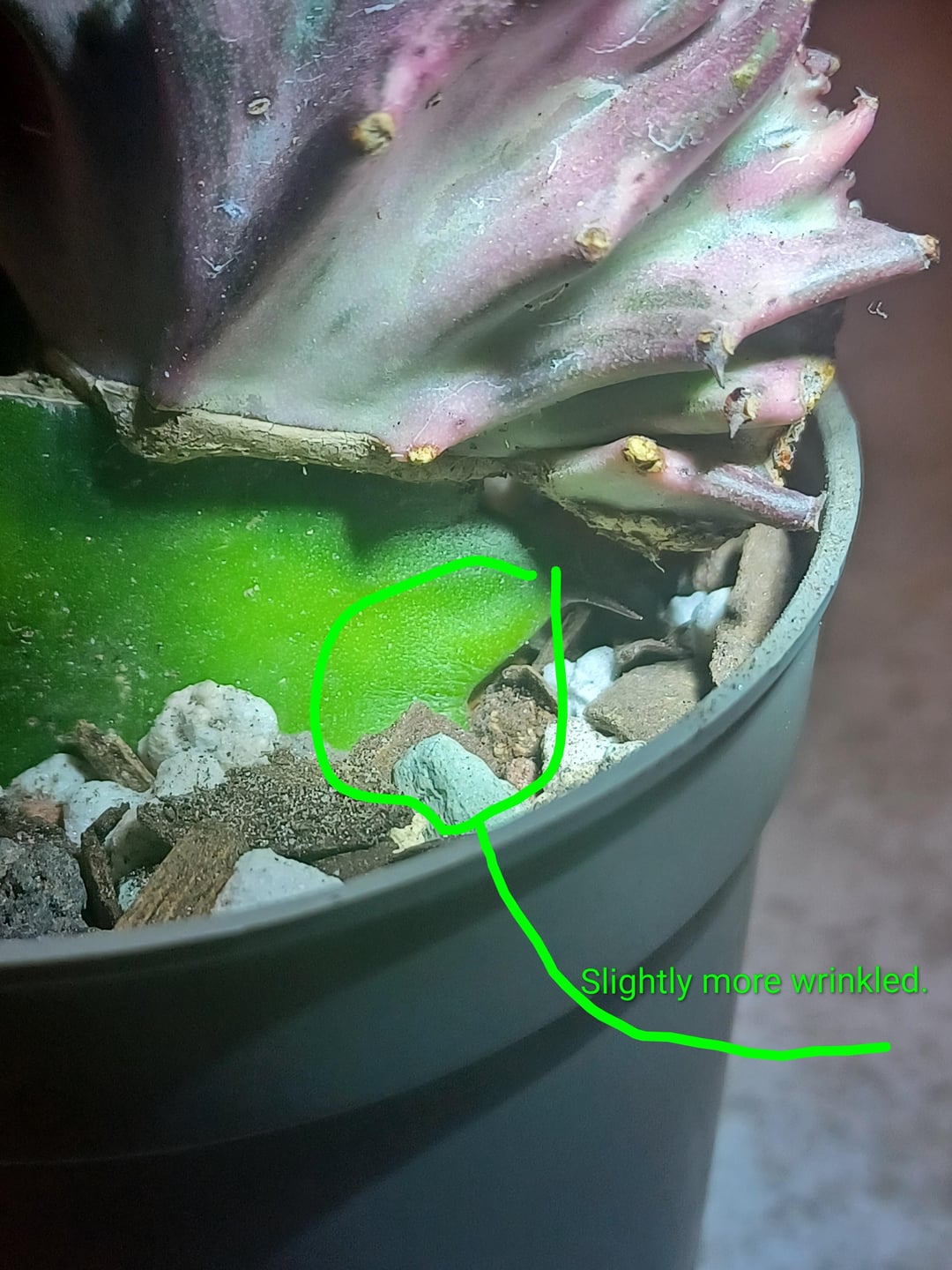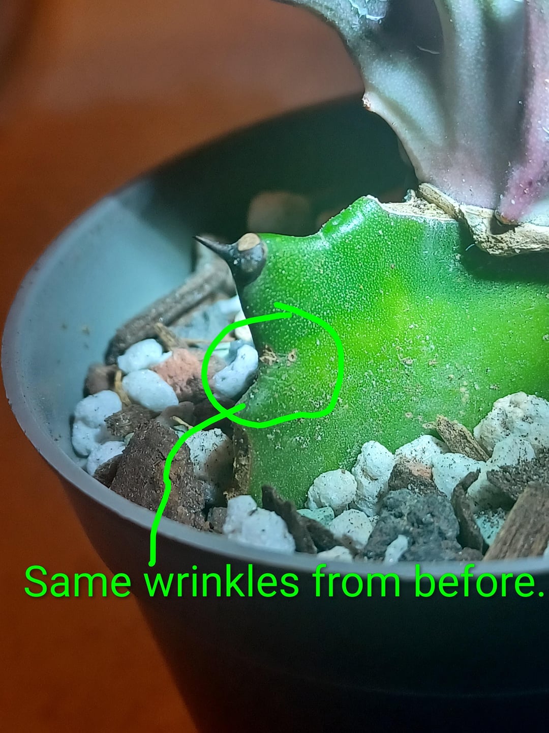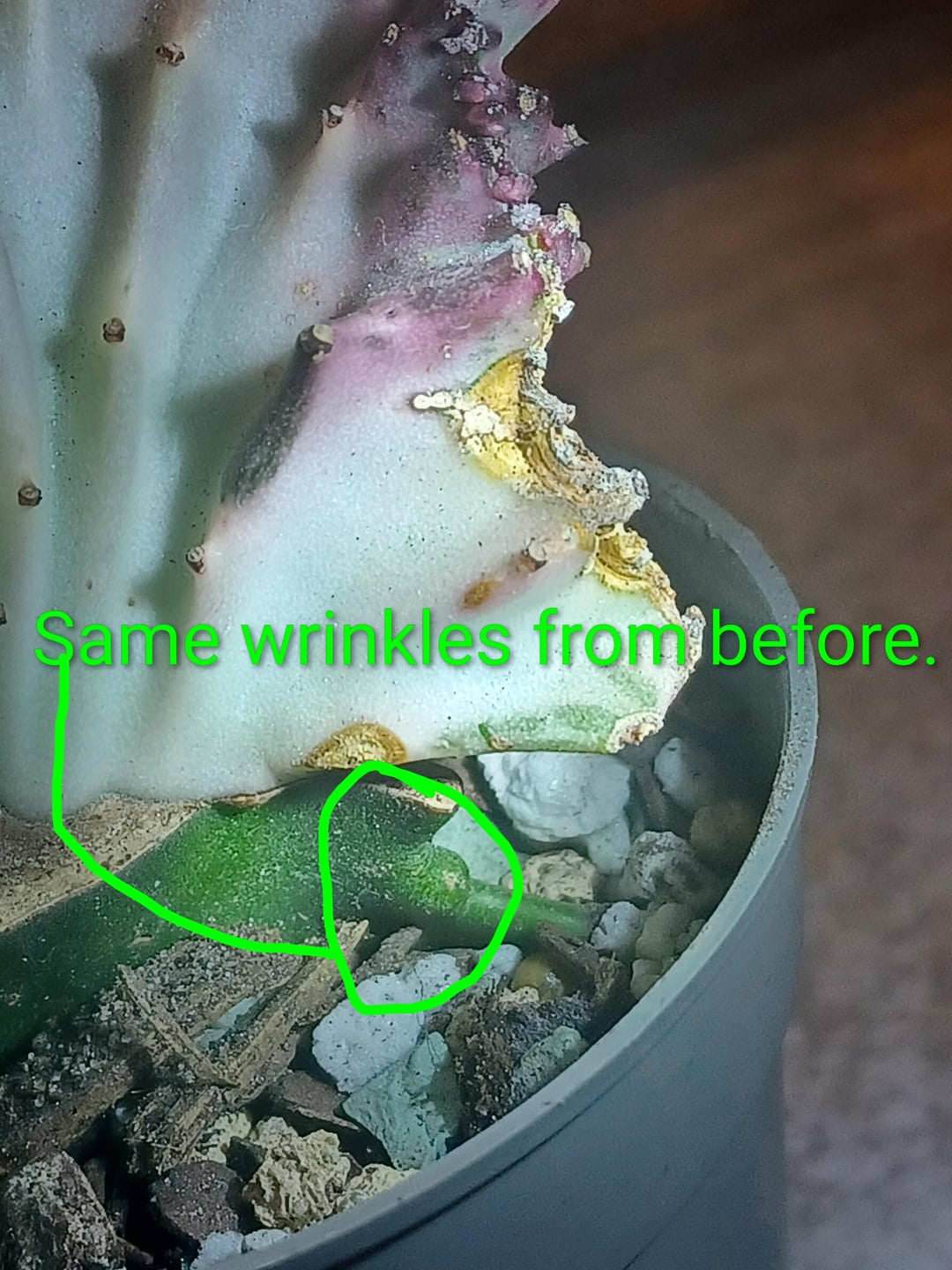 It's been 9 days since i left my crested variegated euphobia white ghost alone to wait for watering the on the first photo of the graft is slightly more wrinkled while the second and third photo the wrinkles on the other side of the graft is the same while the actual euphobia white ghost is showing winkles in 4 photos. It's also late winter in (february 12, 2026).