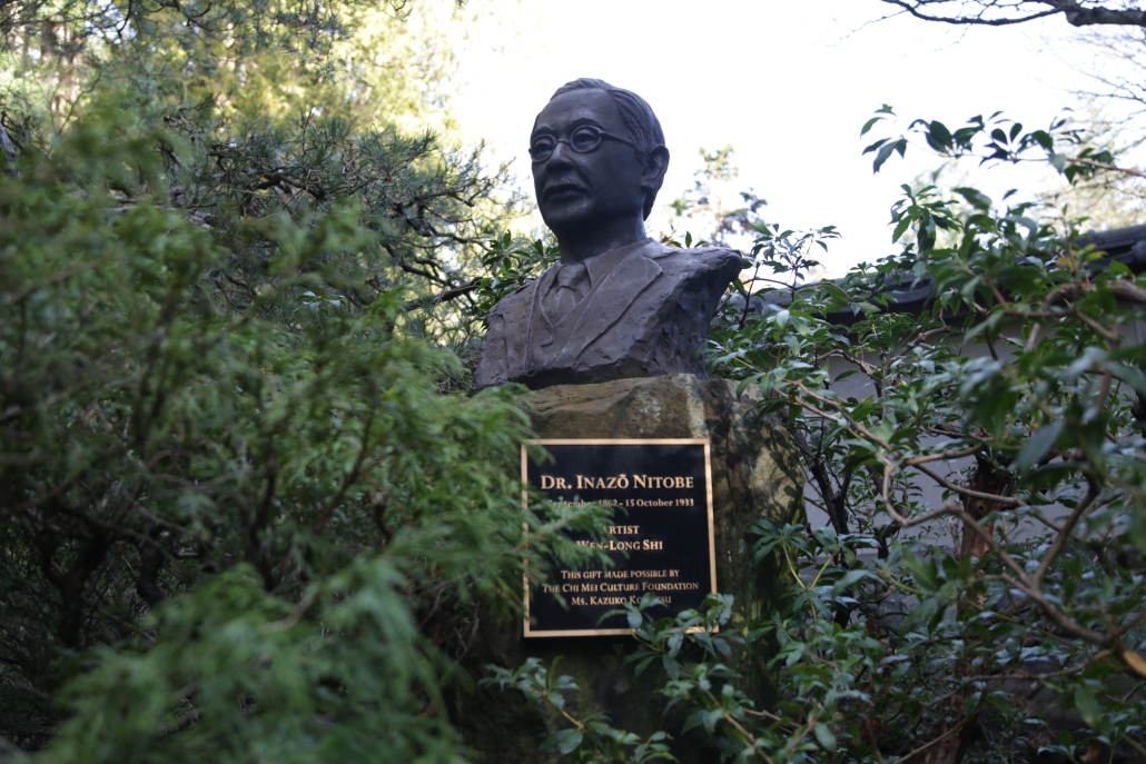 A detailed bust of Inazo Nitobe overlooking the pond. (Gabriel Ruy / BCIT News)