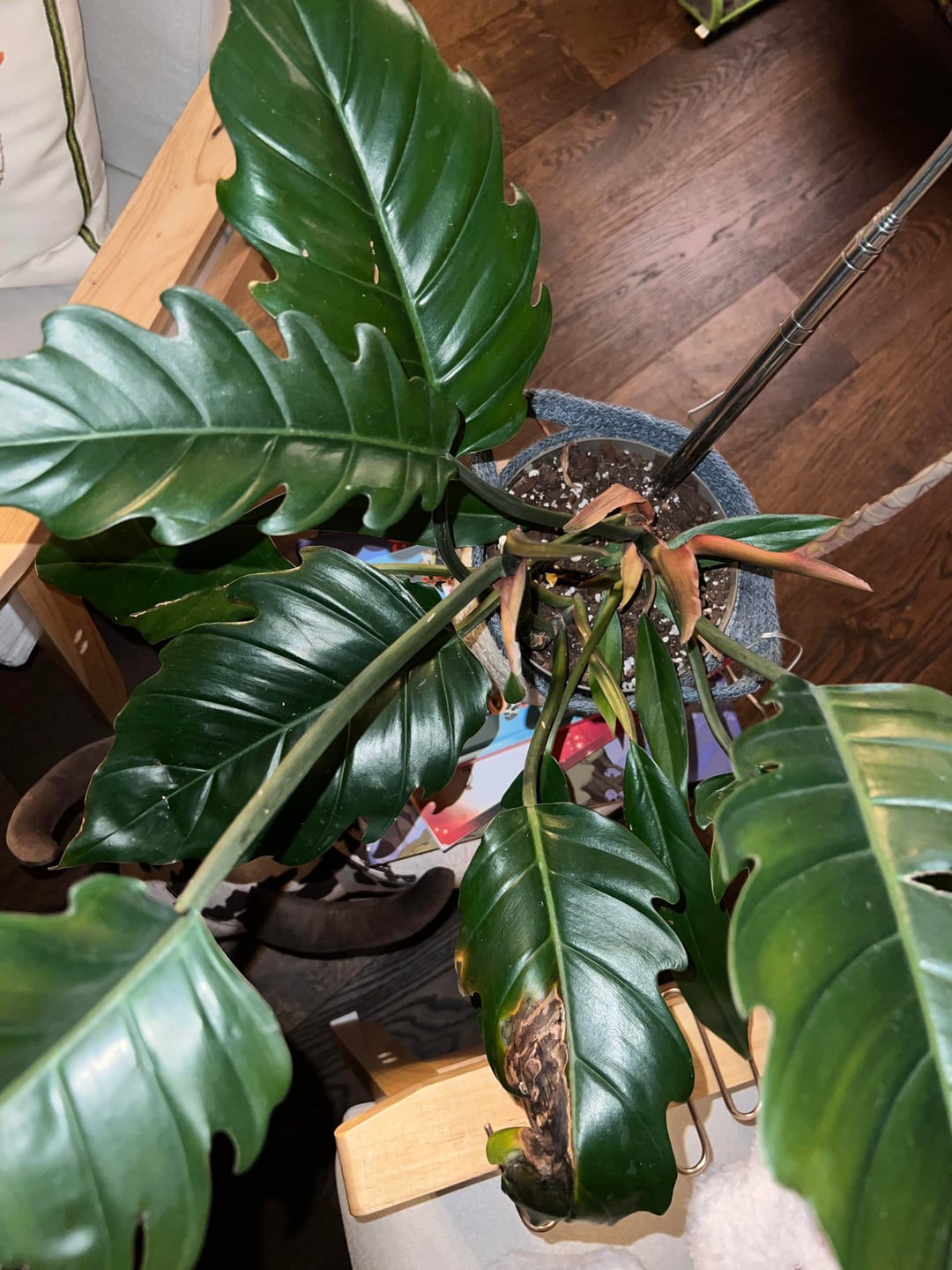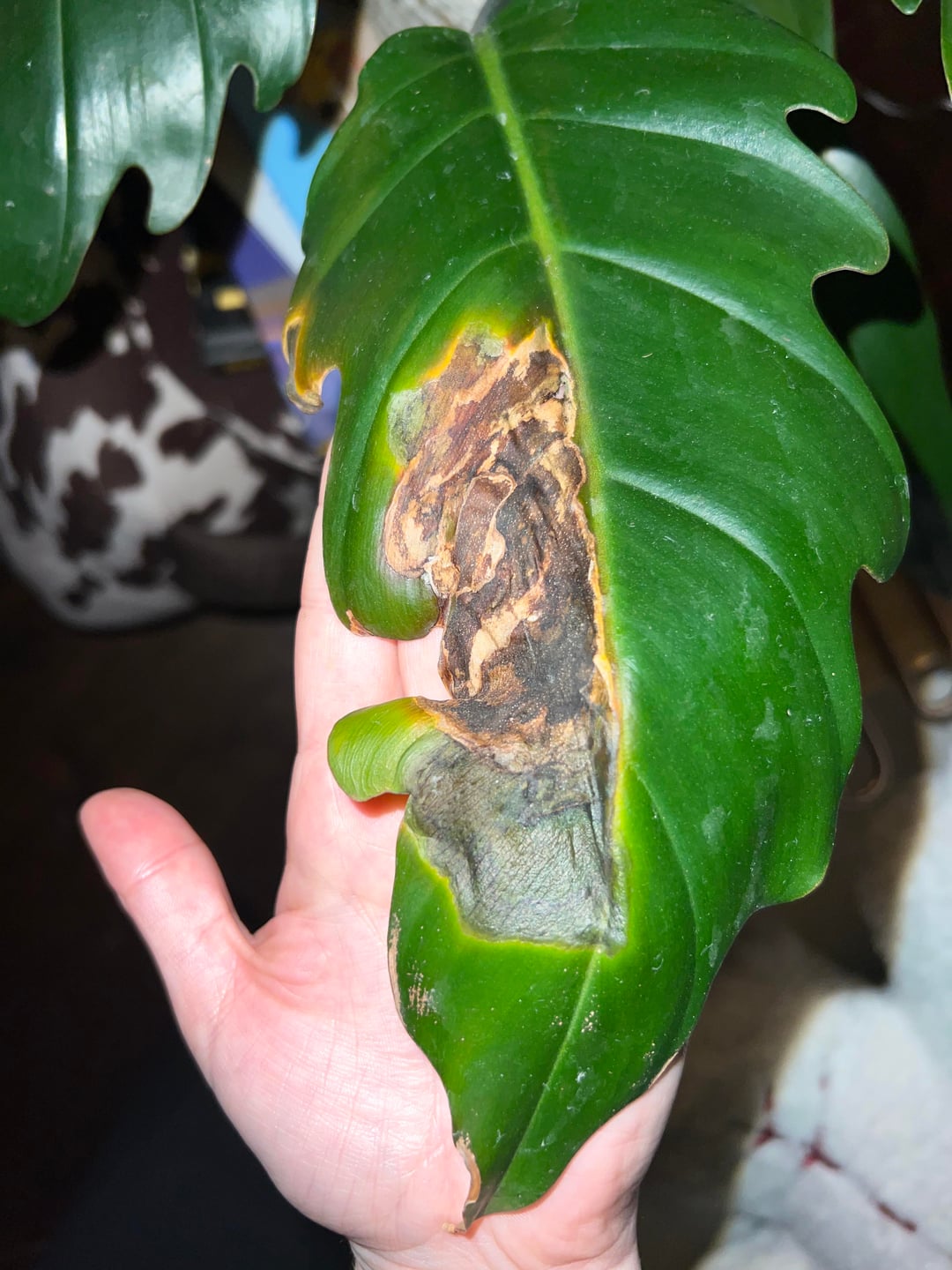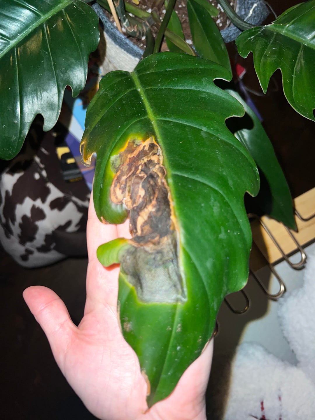 This happened to another leaf I had, I cut it off and now this one is doing the same thing. I water it when it’s dry and it gets full sun in the winter and a grow light. It gets mushy and then dries out. It’s going to the leaf tip. Thoughts?