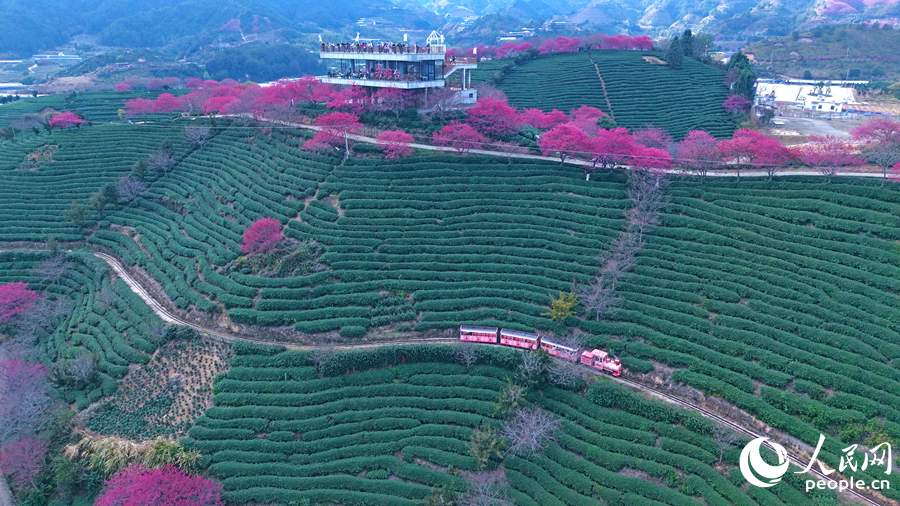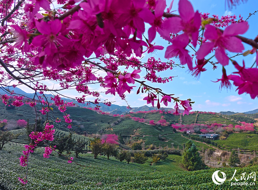 Photo shows cherry blossoms in a tea garden in Yongfu town, Zhangping, a county-level city administered by Longyan city, southeast China’s Fujian Province. (People’s Daily Online/Li Changqian)