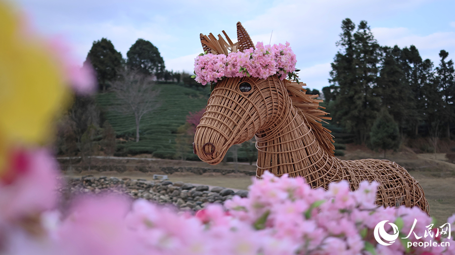 Photo shows a bamboo-woven horse in a tea garden in Yongfu town, Zhangping, a county-level city administered by Longyan city, southeast China’s Fujian Province. (People’s Daily Online/Li Changqian)
