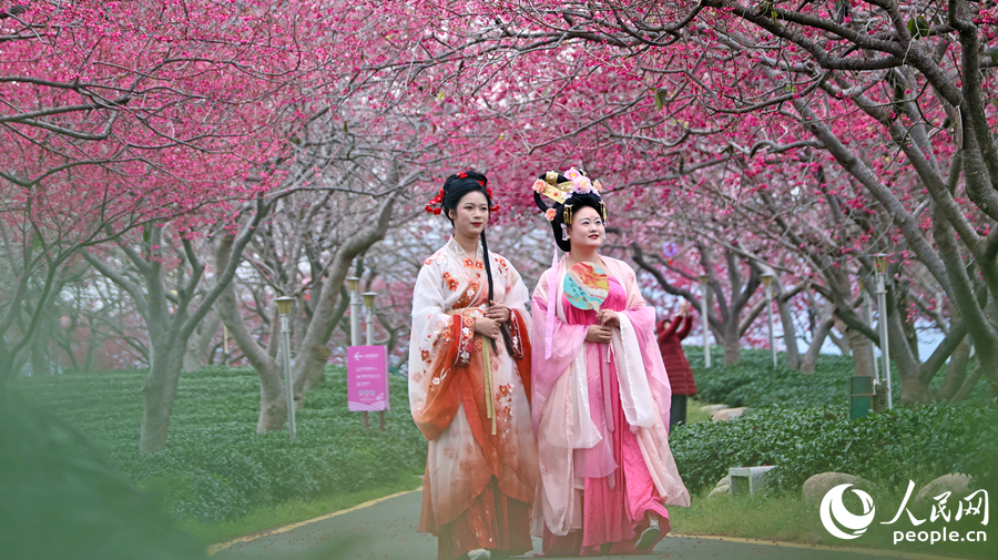 Tourists clad in Hanfu pose for photos under cherry blossoms in a tea garden in Yongfu town, Zhangping, a county-level city administered by Longyan city, southeast China’s Fujian Province. (People’s Daily Online/Li Changqian)