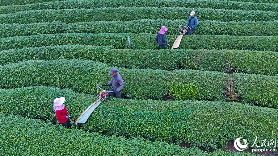 Farmers prune tea trees in a tea garden in Yongfu town, Zhangping, a county-level city administered by Longyan city, southeast China’s Fujian Province. (People’s Daily Online/Li Changqian)