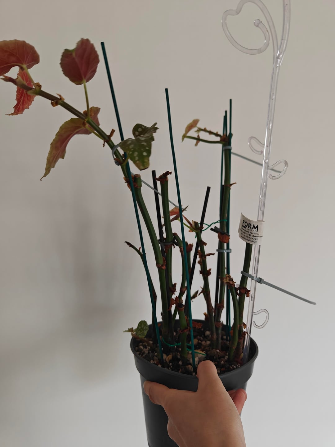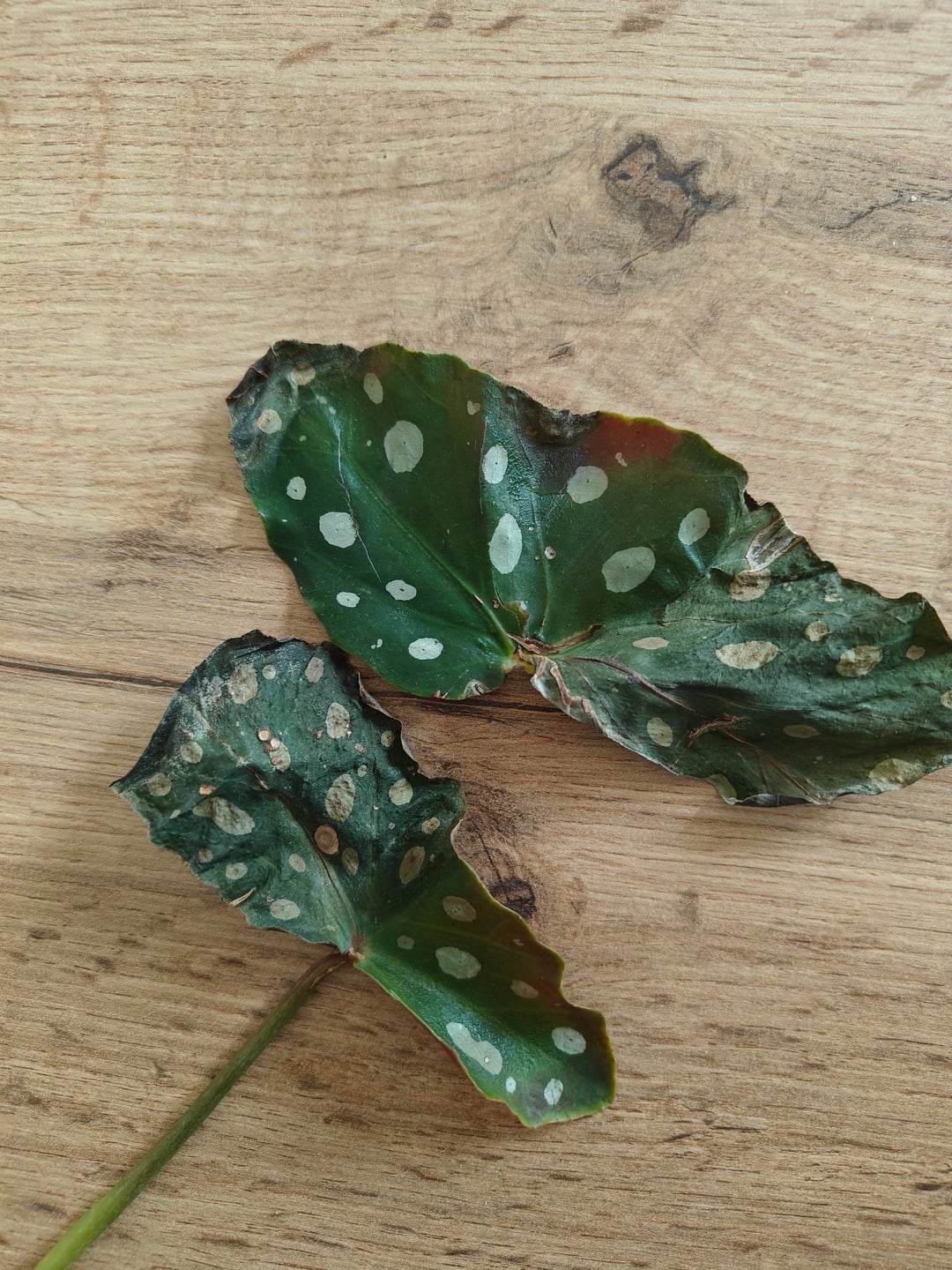 My begonia was not doing so great, her leaves got crispy and dropped so I cut it and propagated, it's rooting well I guess, but what do I do with this leggy thingy I am left with? Even when it pushes new leaves, they get crispy. I even put a humidifier next to her, but no help. She sits next to a big window, but it's winter now, so it can't be a sunburn – there's no direct sun currently. Maybe a grow light burning? Any suggestions what to do with it would be much appreciated