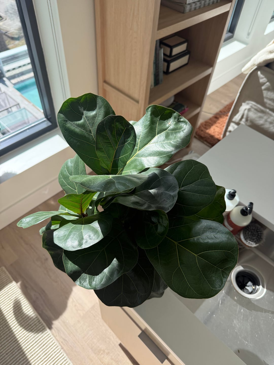 I got this fiddle leaf from Costco about a year ago. She has more than doubled in leaves and has gotten very “fluffy” however she has not gotten any taller. Someone told me to cut her down so she branches up? Just need someone to tell me what to do and how to make her be more of a tree 🙂